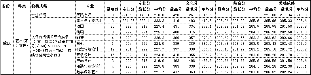2020年重庆 艺术类录取情况