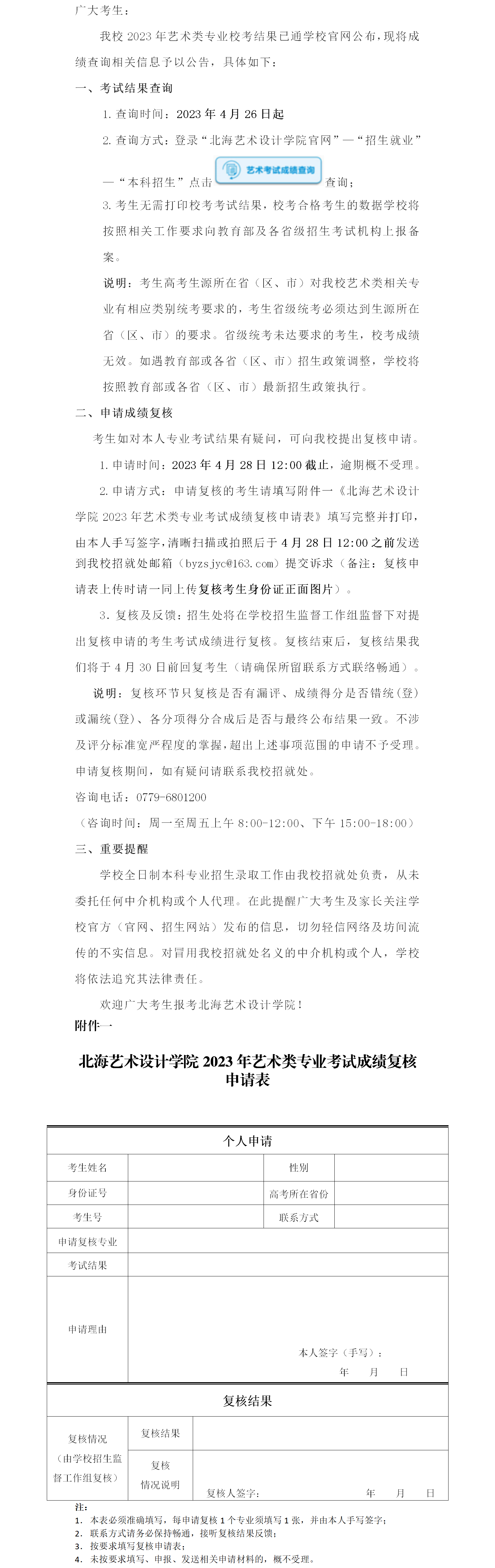 北海艺术设计学院2023年艺术类专业 校考结果查询及复核办法
