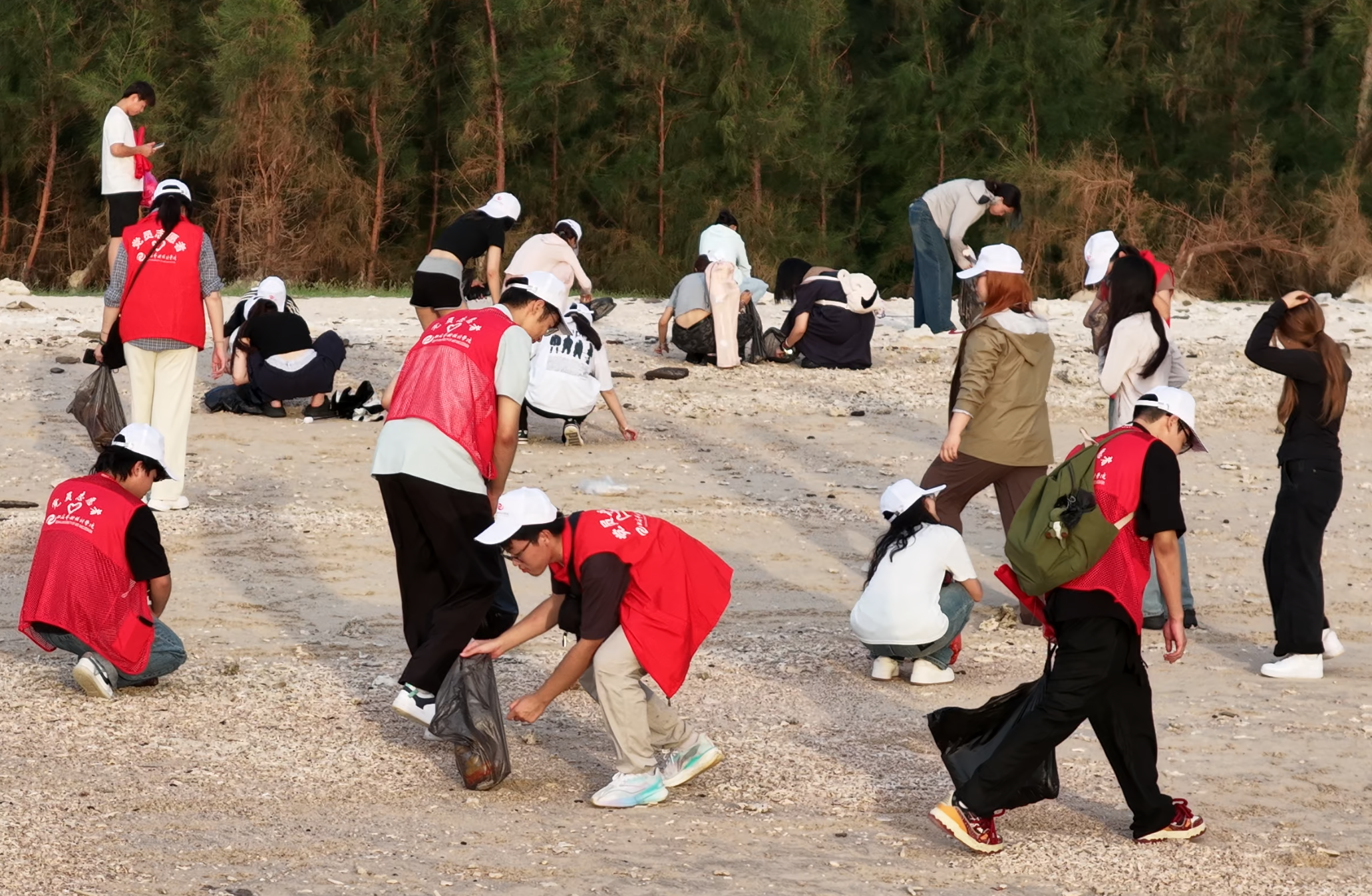 活动伊始,志愿者们纷纷穿上红色马甲,按照分团委指导老师安排的区域分为三个小组展开行动。他们沿涠洲岛蜿蜒的海岸线散开,俯身拾起被潮水推上岸的塑料瓶、渔网碎片和零食包装——那些藏匿在碎珊瑚与礁石缝隙间、附着在沙滩贝壳旁的垃圾,都被他们仔细地找出来,一一收集进分类垃圾袋中。此刻夕阳照在每一位志愿者的身影上,映照出影视动画学院分团委团结奋进的集体意识与不负使命的责任担当。