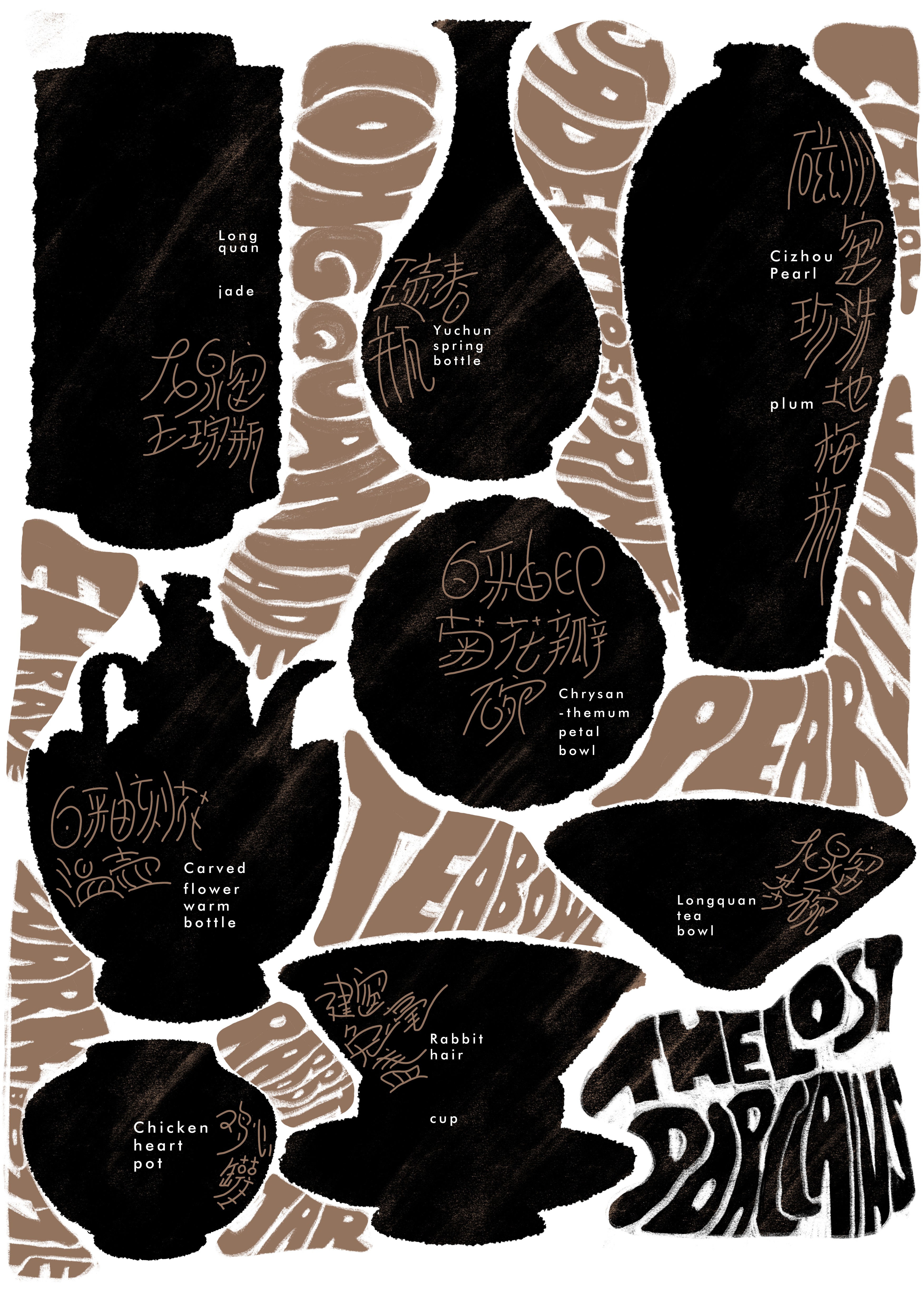 通过手写文字与文物剪影的结合,表达对文化遗产的追忆与思考。文字与陶罐在画面中交错叠加,形成“物与字”的对话——汉字如烙印般附着于陶罐表面,象征文化根脉的延续;这一创作,旨在唤起观者对文物保护的关注,探讨文化归属与民族记忆的深层意义。