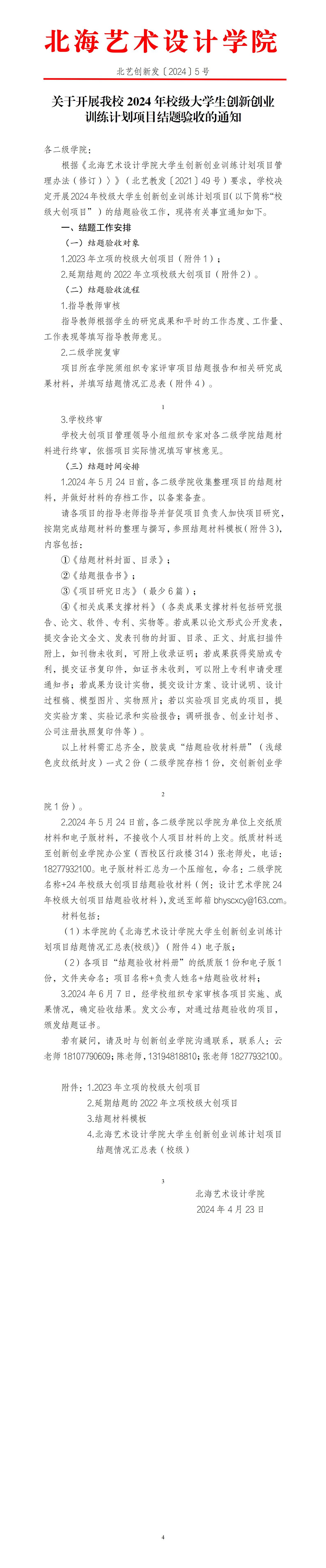 北艺创新发〔2024〕5号 关于开展我校2024年校级大学生创新创业训练计划项目结题验收的通知