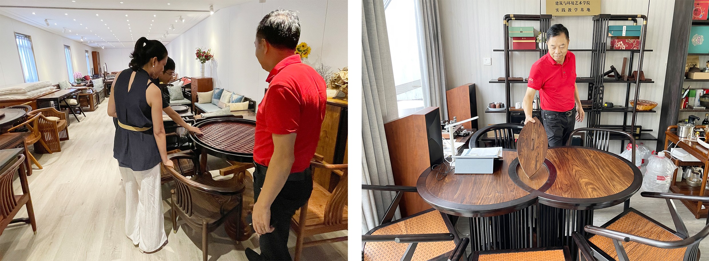 走访过程中,学院一行参观了工作室的红木家具展示区和生产车间,张世轩现场演示榫卯结构制作工艺与新产品。周家辞老师认为,将实地参观学习纳入实践课程,利于学生掌握传统与现代技术融合之道。未来,学院将定期组织学生参与实践活动,优秀者可获实习机会;张世轩大师将开展讲座并参与课程开发。孙晓莹副主任总结称,此次走访是深化“产教融合”的重要实践,为学院教学改革、服务区域文化创意产业发展提供新思路,未来学院将持续搭建协同创新平台,培养复合型设计人才。(周家辞/摄)