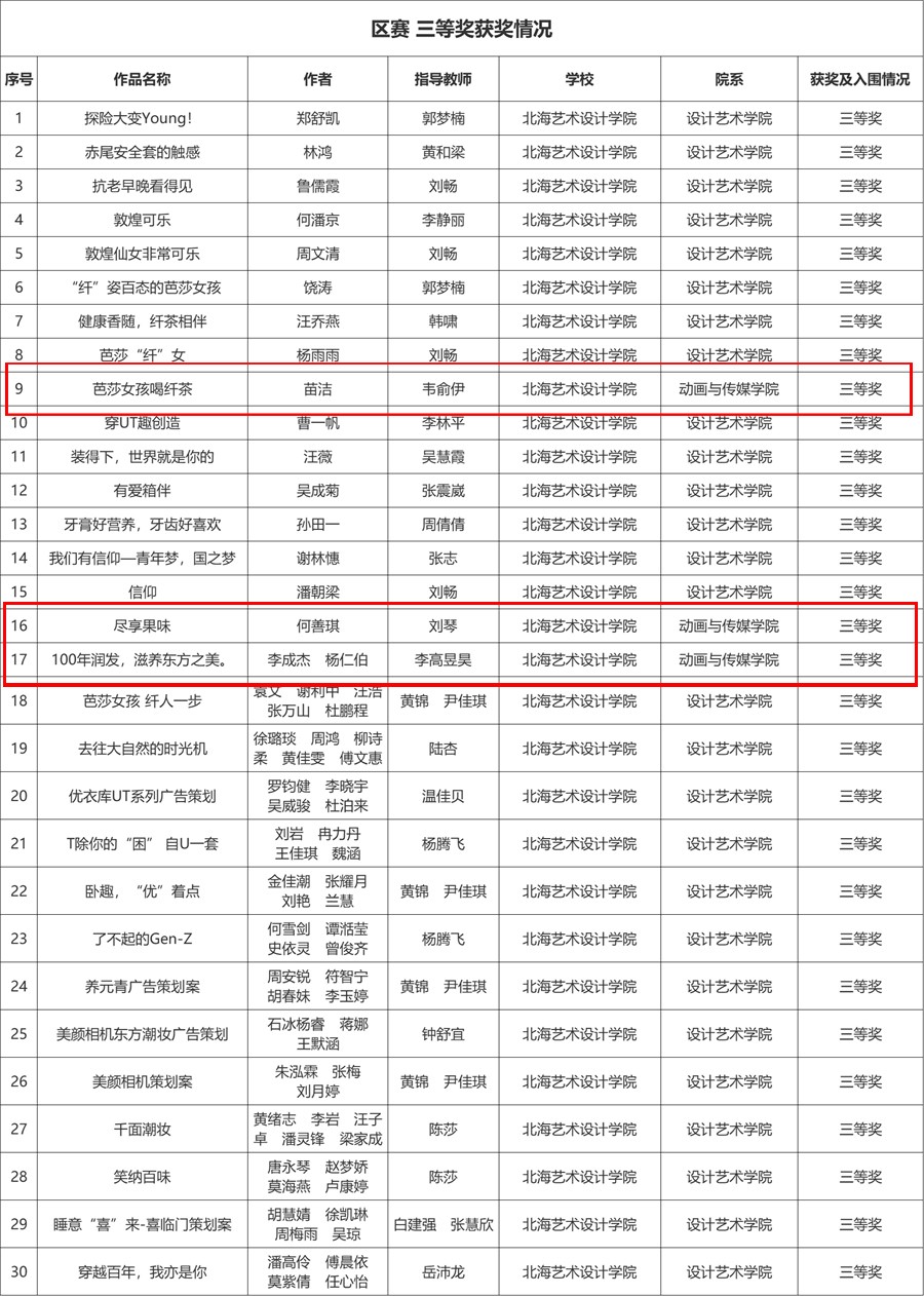 8月17日,2022年第14届全国大学生广告艺术大赛(简称“大广赛”)广西赛区竞赛作品评审工作圆满完成。今年我校师生在此次大赛中再次斩获佳绩,共获得区级一等奖6项,二等奖14项,三等奖30项,入围奖20项;学校获评广西赛区“优秀组织院校”称号。