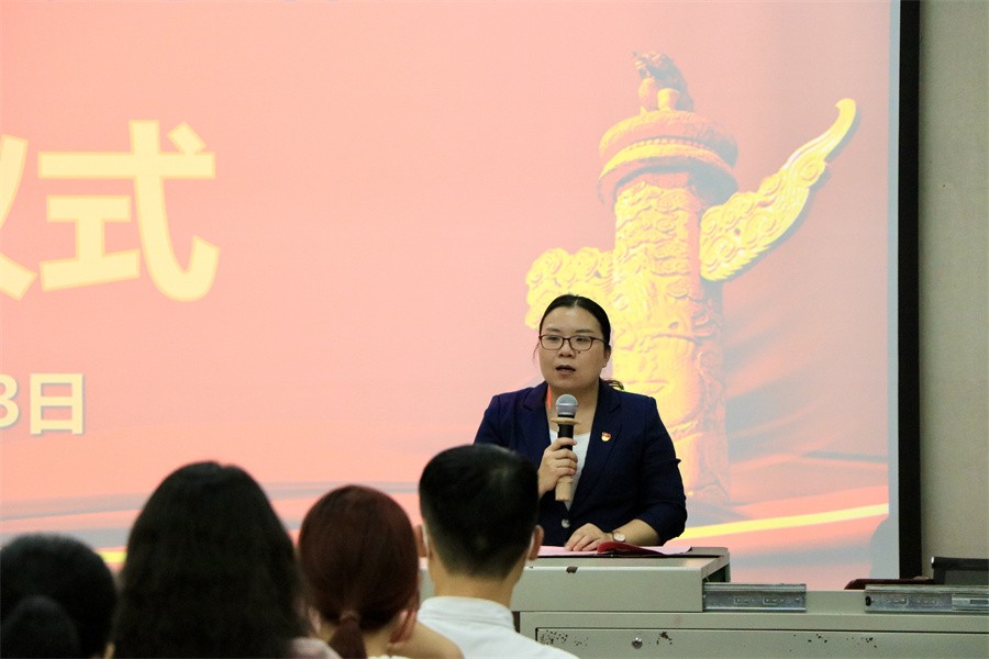 开班典礼在庄严的国歌中正式拉开序幕,与会全体成员起立,奏唱国歌。学员代表播音专业2102班的张洲上台发言,她号召同学们严格要求自己,遵守纪律,主动完善自己,逐步向党组织靠拢。