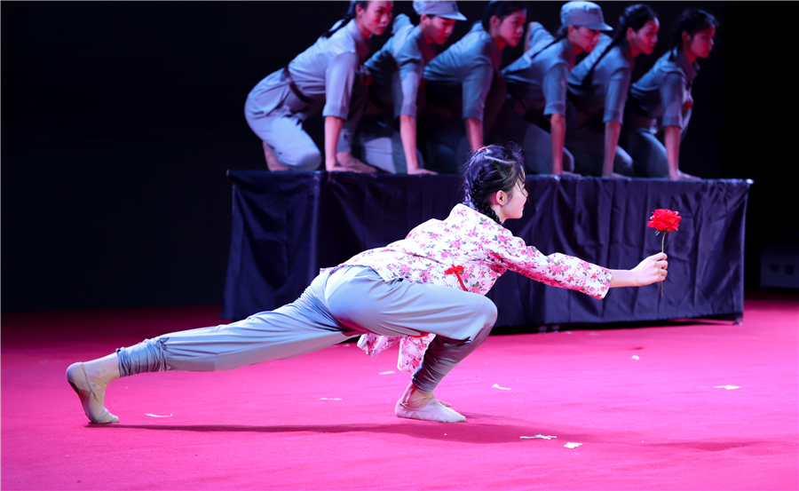 舞蹈表演1903班的学生带来《战地山花别样红》,带我们回到了过去的峥嵘岁月,感受到先辈们前赴后继牺牲的伟大精神。男生小组合唱《把一切献给党》,清朗的歌喉表达了中华儿女对党的深切热爱。 舞蹈《无名的功勋》,场面宏伟震撼,伴随着炮响轰隆的音效,让我们回忆起战乱和无名英雄崛起的年代,为这些无名的功勋致敬。 话剧社带来的《抗日英雄》,那些英勇无比的战士们,那些难以言喻的爱国情感,都深深地刻在了每个中华儿女的骨子里,令人动容。
