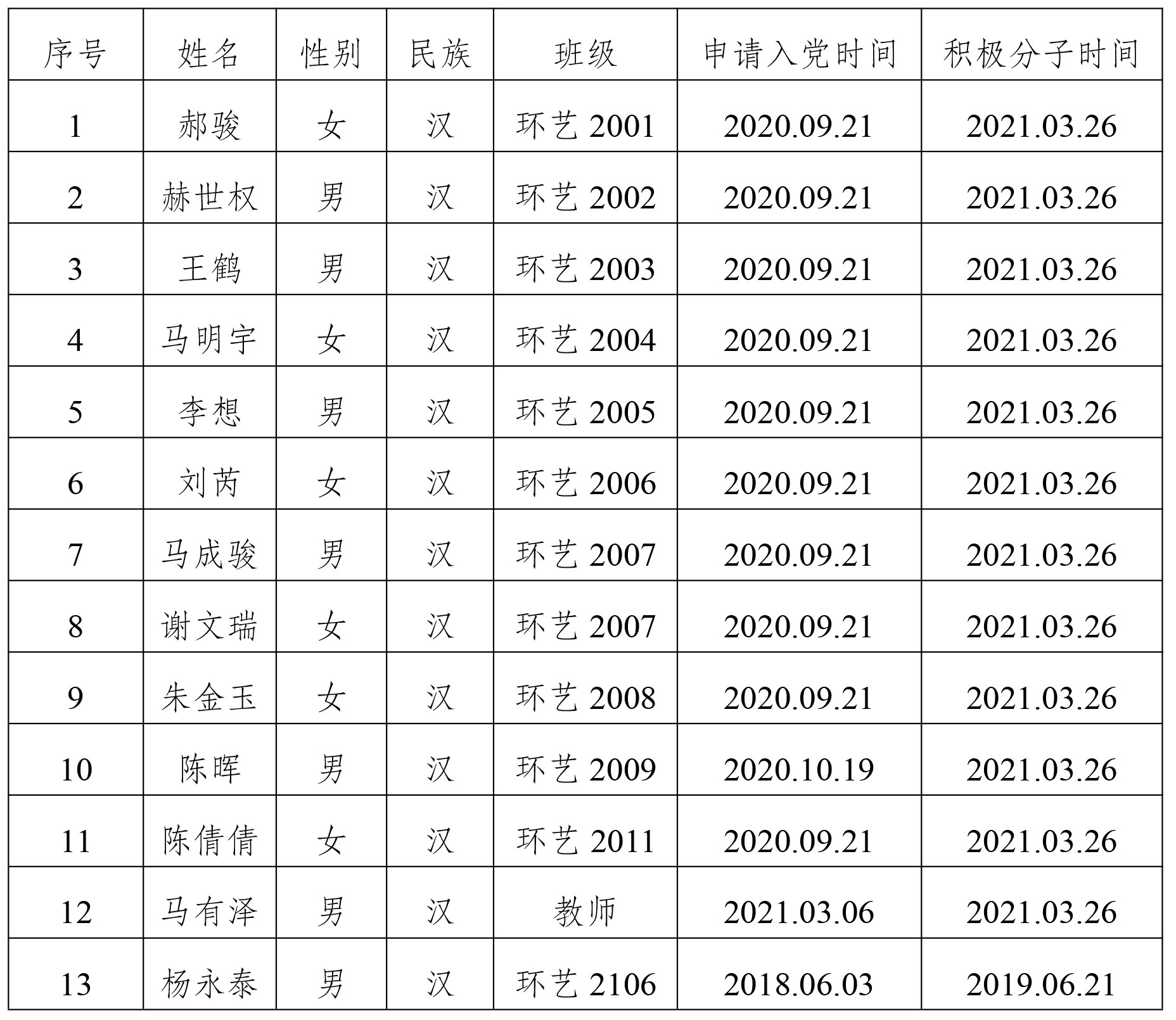 在征求党小组和党员、群众意见的基础上,经支部委员会审查,拟将郝骏等13位同志列为发展对象人选。根据发展党员工作有关要求,现将其有关情况公示如下,经党支部培养教育和考察,该同志已基本具备党员条件,在征求培养联系人、党员和群众意见的基础上,经中共北海艺术设计学院建筑与环境艺术学院学生第一支部委员会2022年10月11日讨论同意列为发展对象人选。