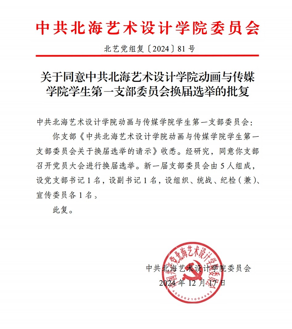 关于同意中共北海艺术设计学院动画与传媒学院学生第一支部委员会换届选举的批复