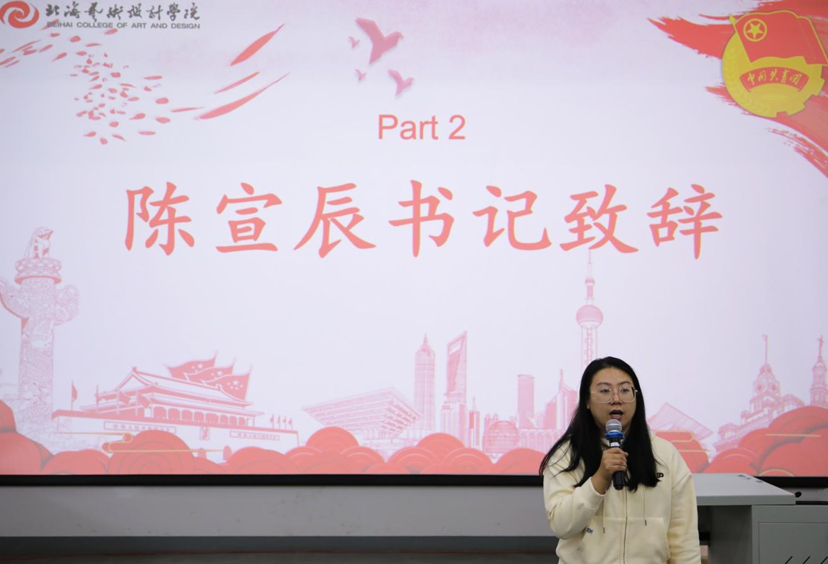 大会伊始,全体成员奏唱团歌,庄重的旋律拉开了总结大会的序幕。随后,陈宣辰书记上台致辞,她肯定了本学期分团委学生会各部门在服务同学、丰富校园文化等方面的亮眼成绩,也针对工作中的协作衔接、细节把控等问题提出改进建议,鼓励大家以初心践行责任,在反思中稳步前行。