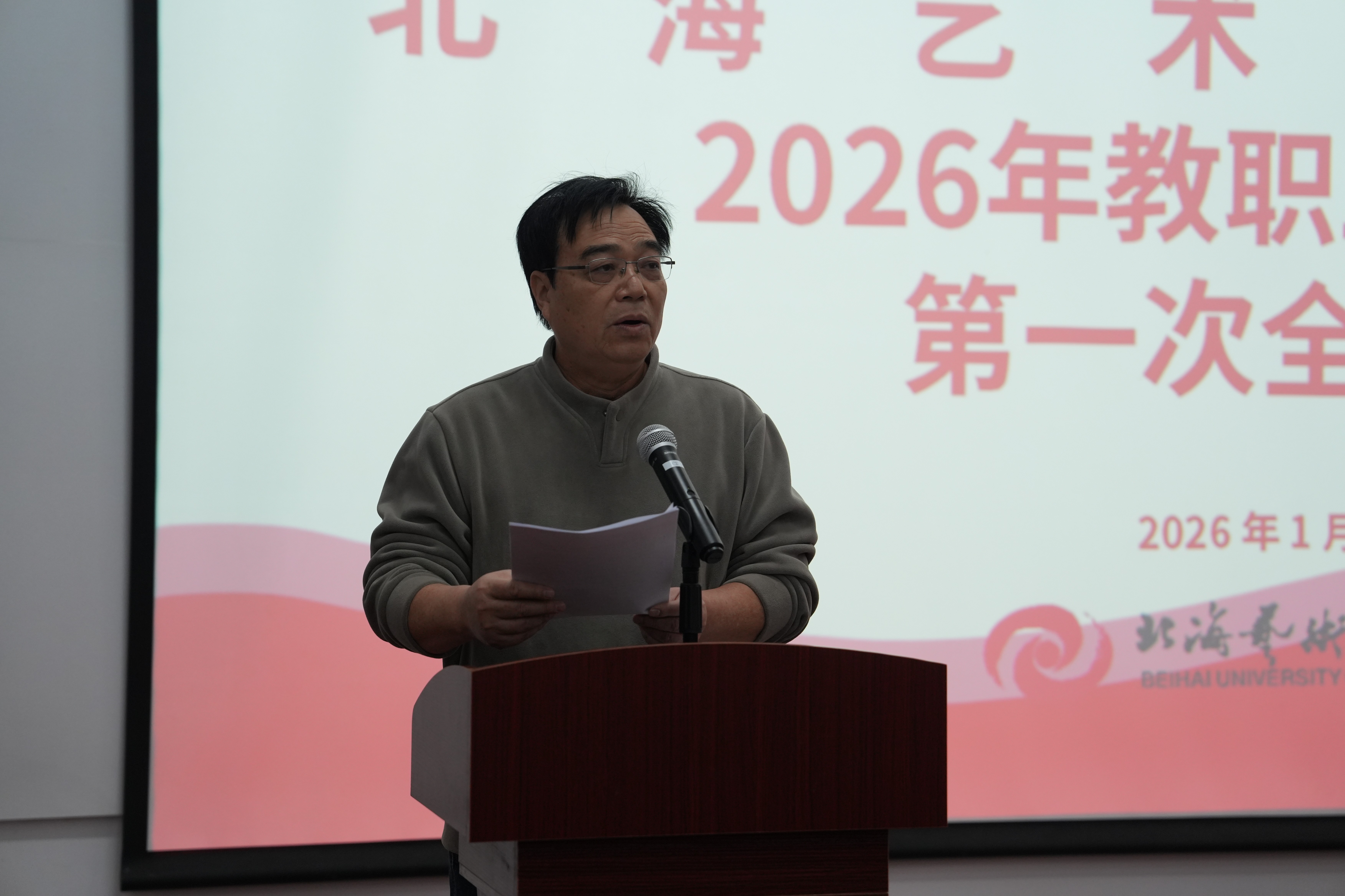 1月17日上午,北海艺术设计学院2026年教职工代表大会暨工会委员会第三届第一次会员代表大会在西校区伦理楼107大讲堂召开。大会应到正式代表125人,实到124人,符合法定人数。会议由包建明副校长和郭巍同志分阶段主持。