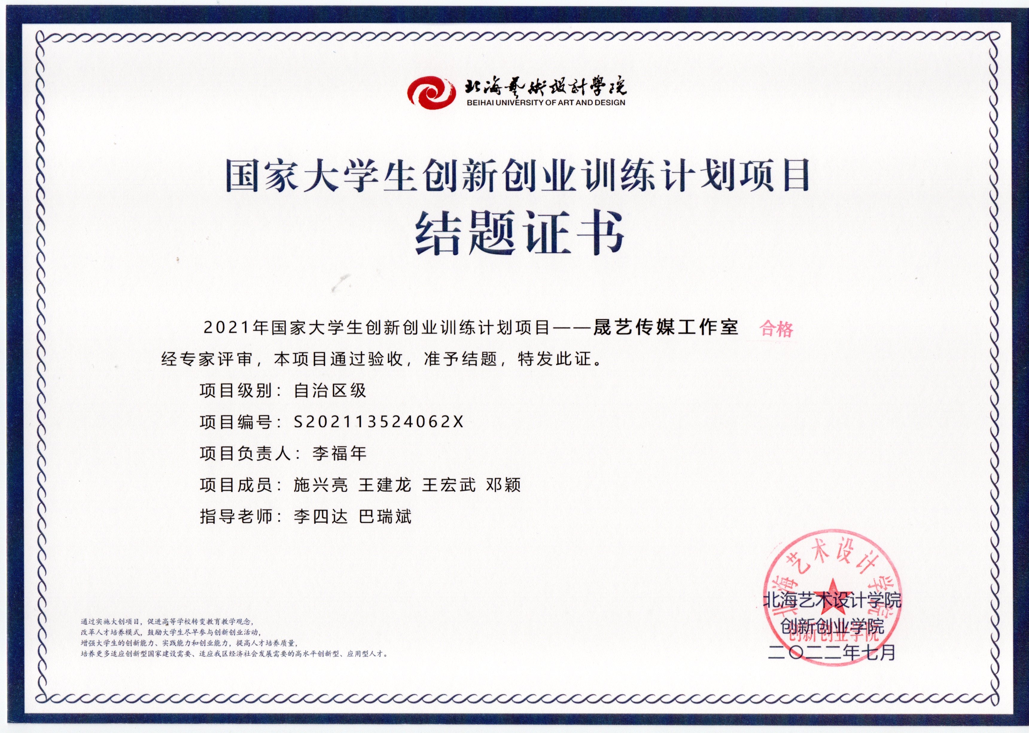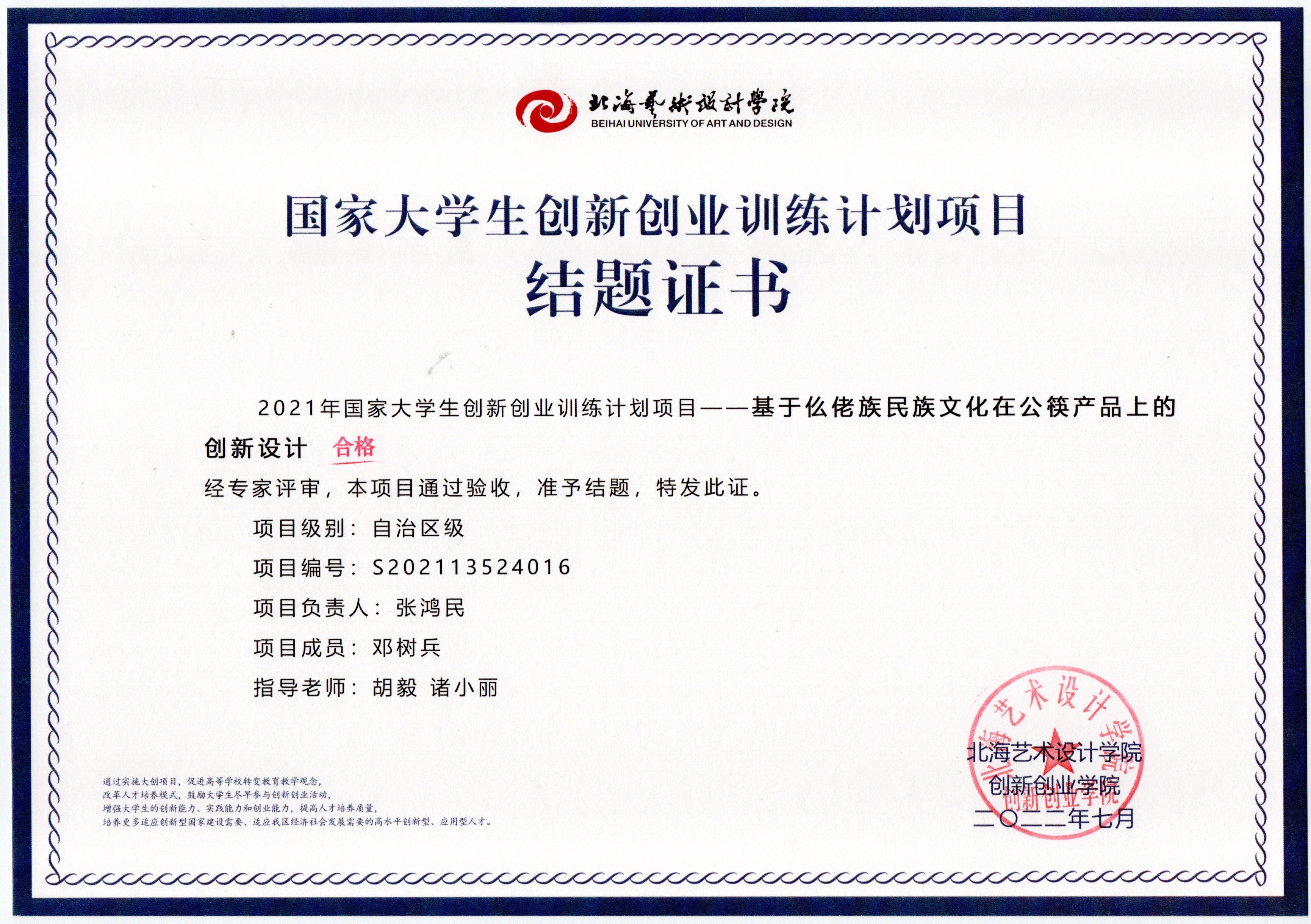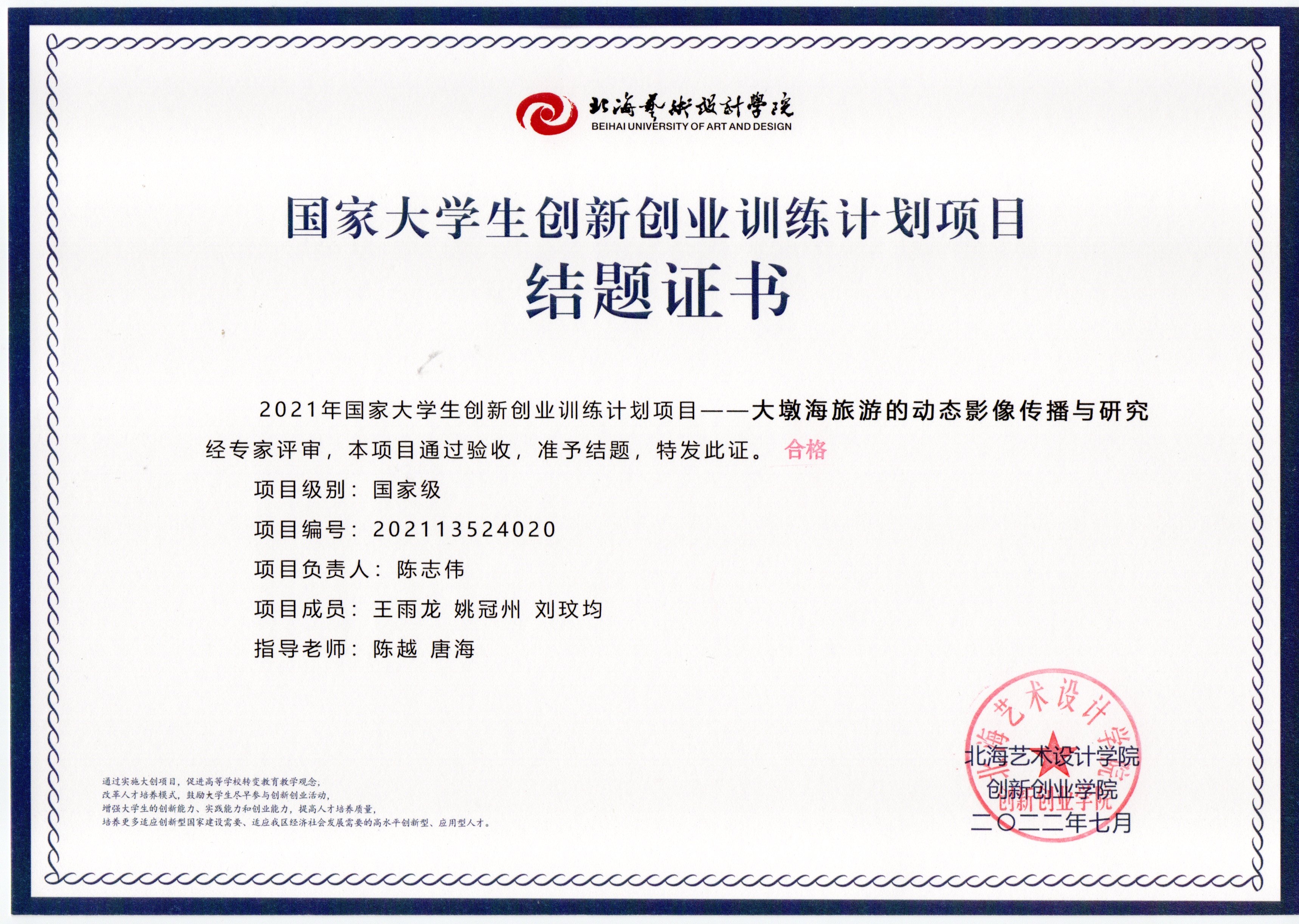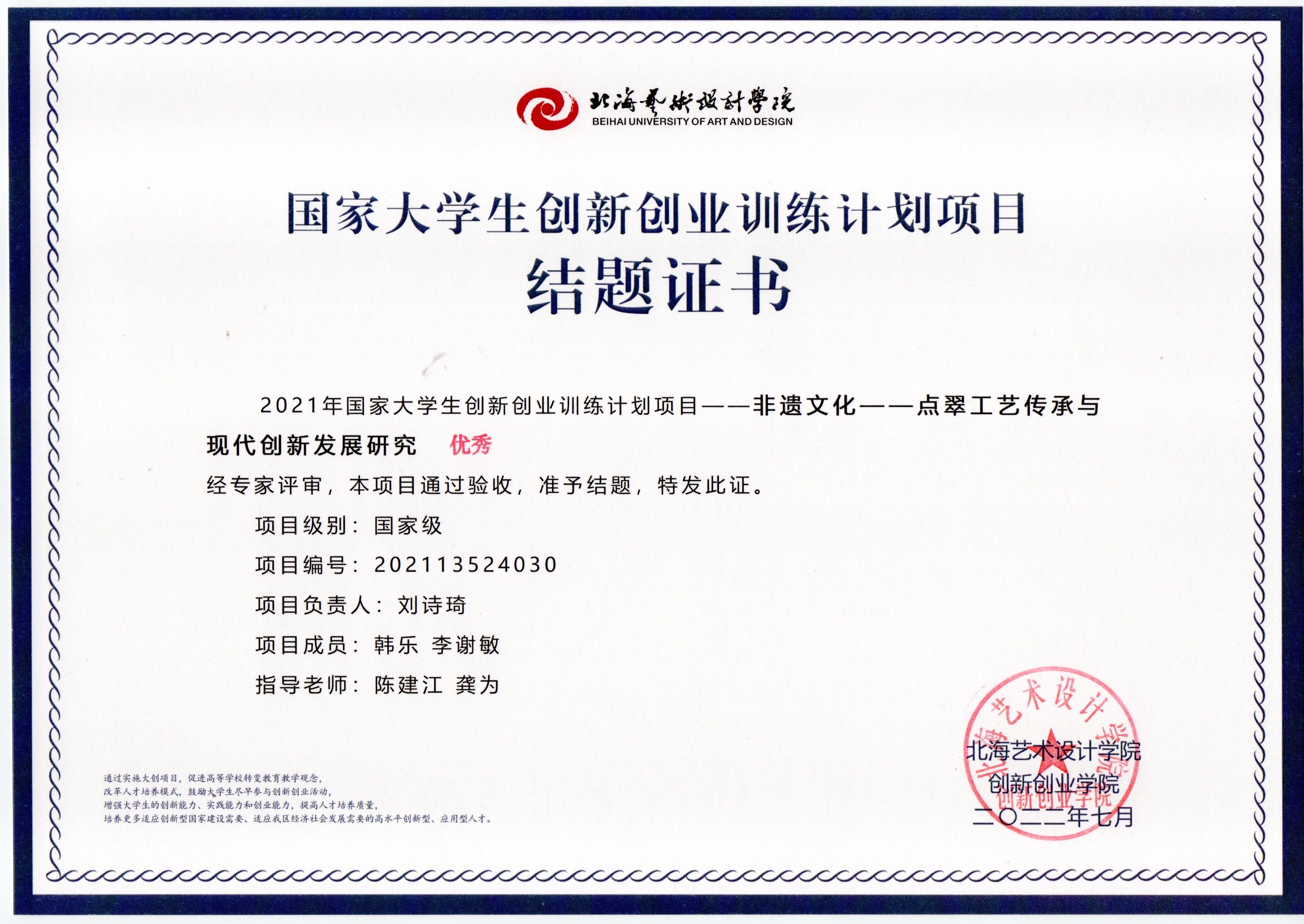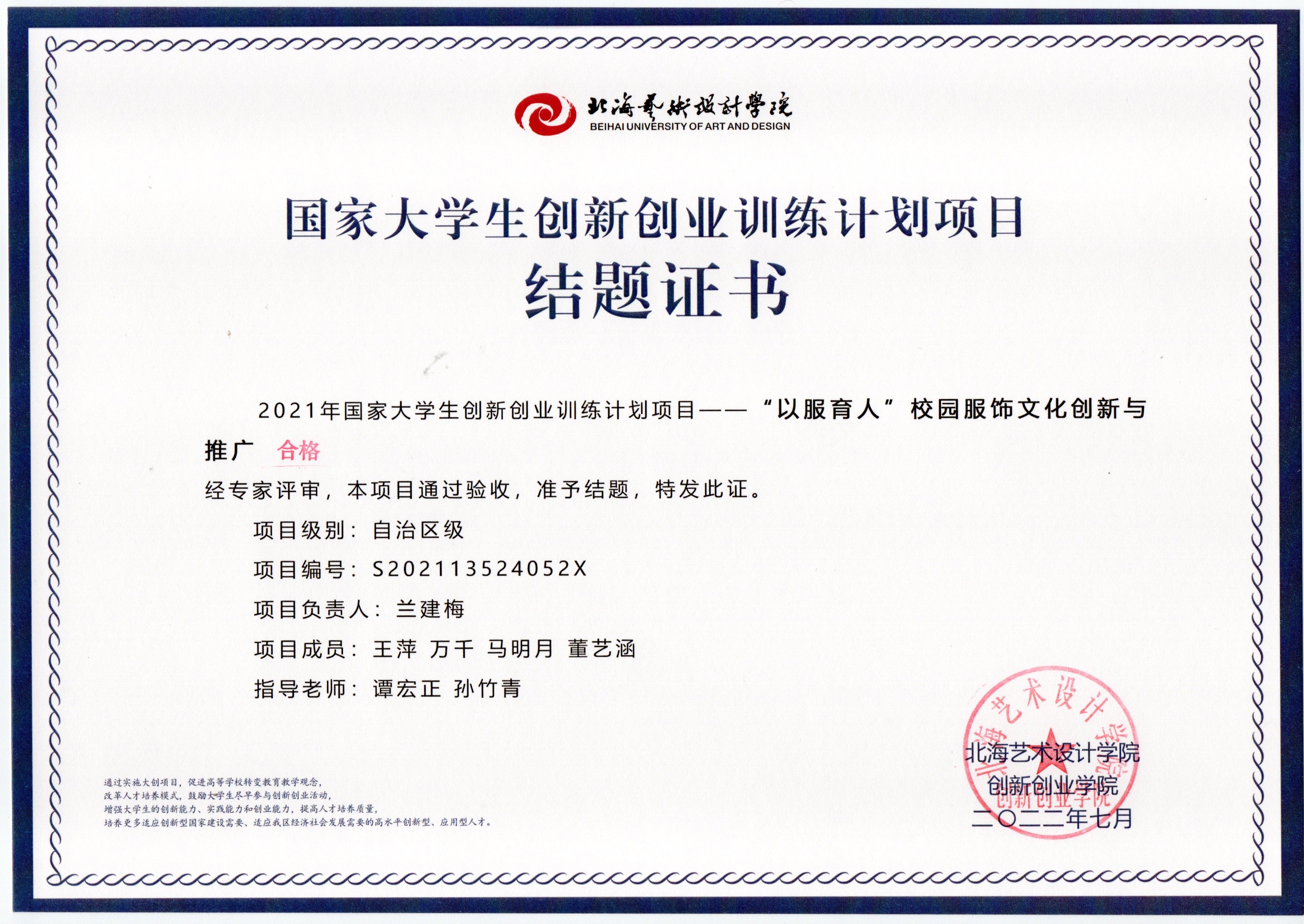 2022年大创项目结题证书(2021立项)
