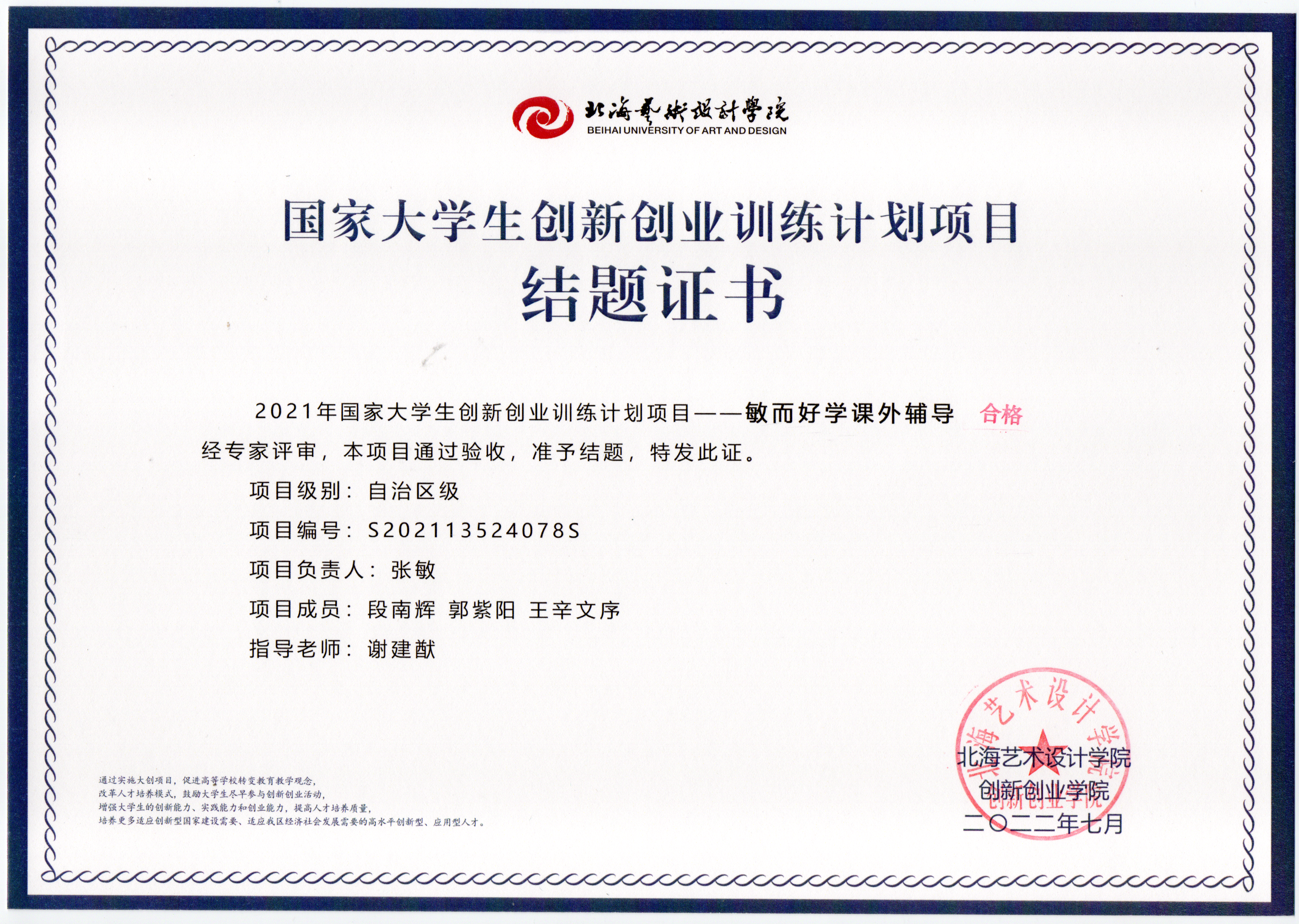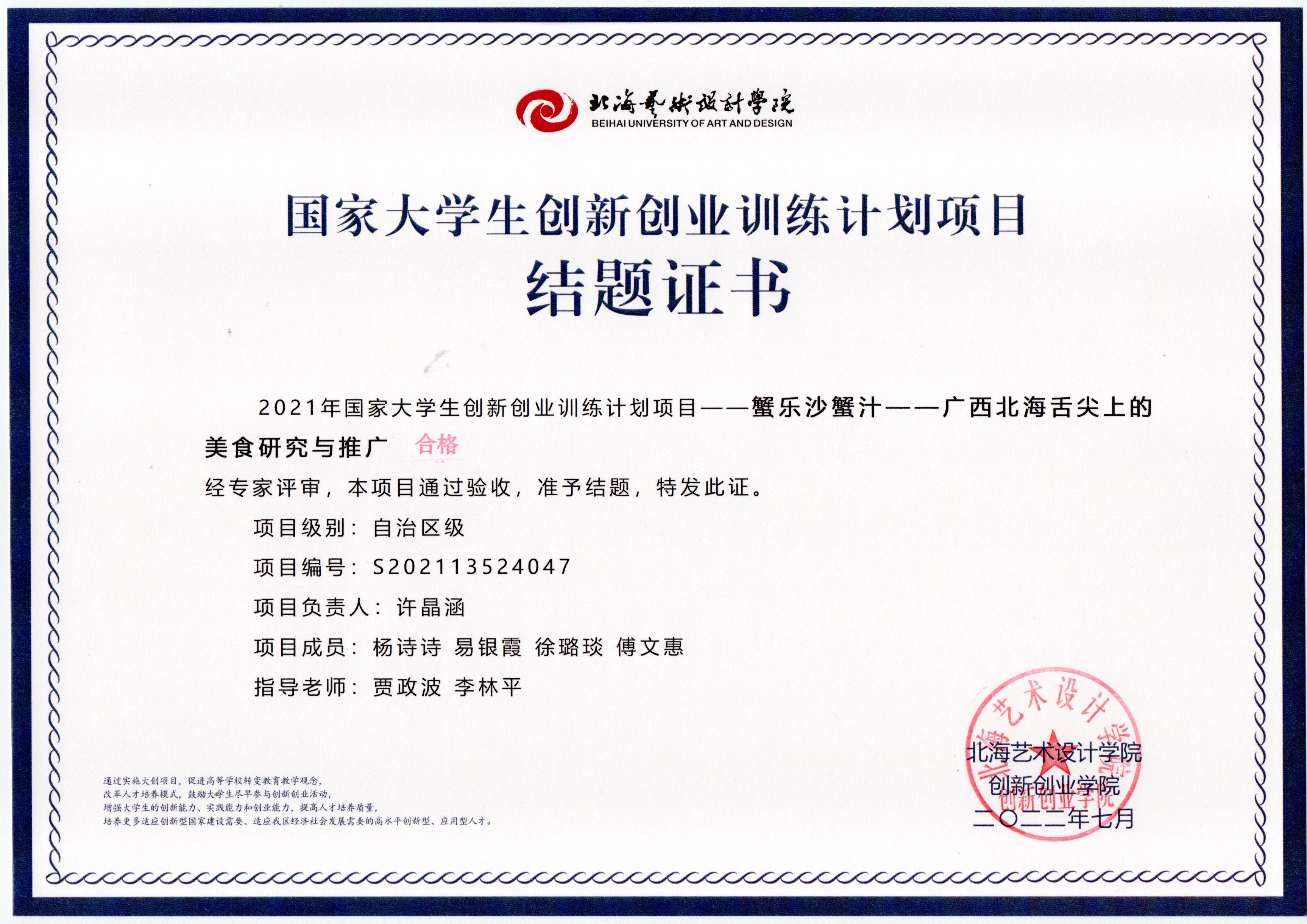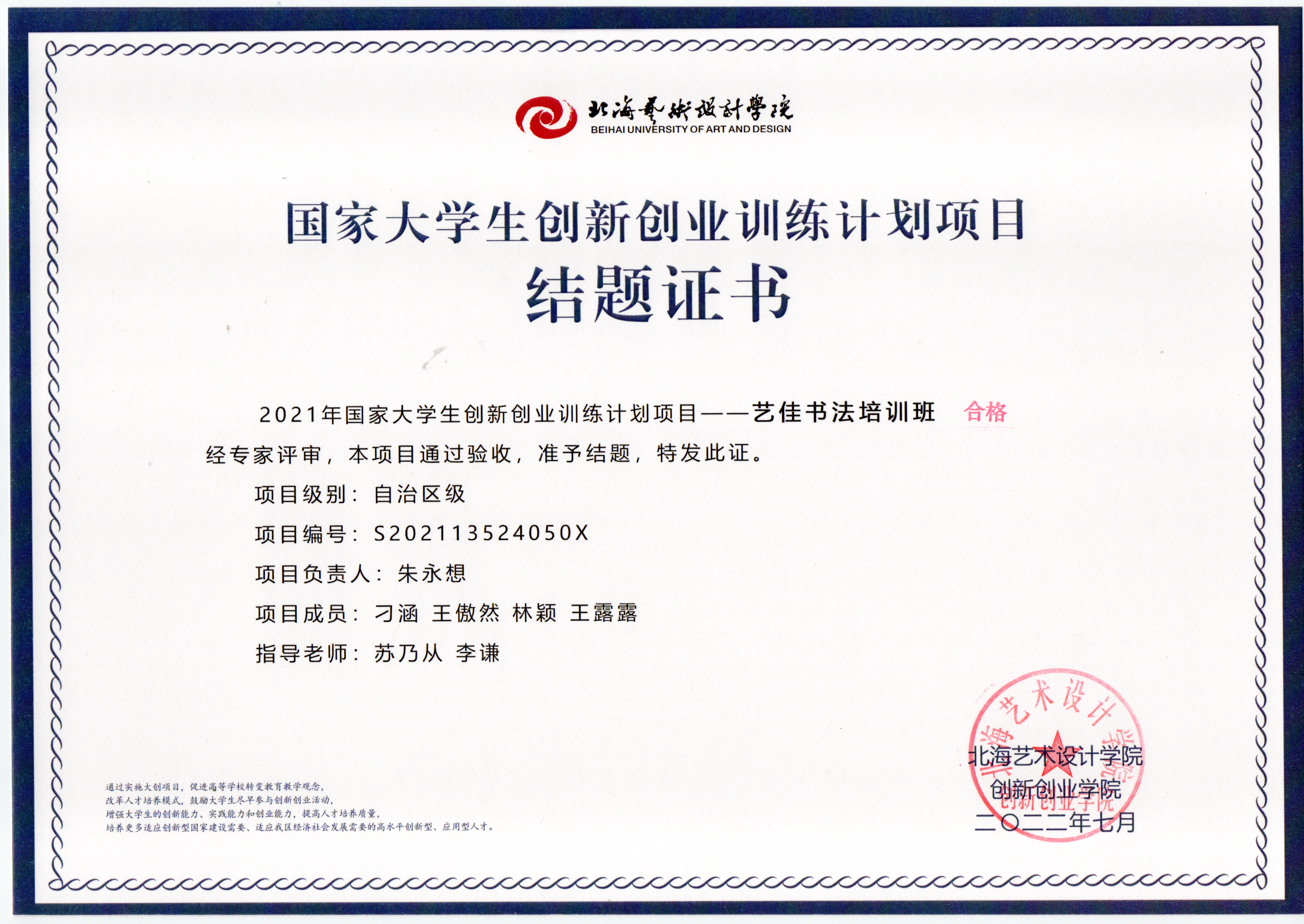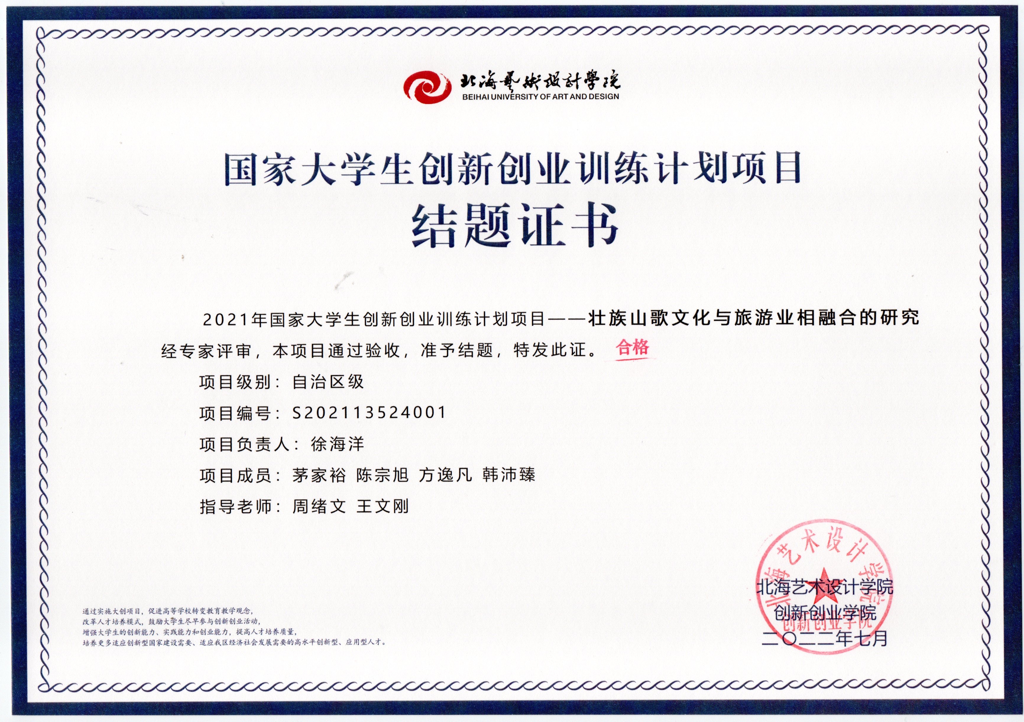 2022年大创项目结题证书(2021立项)