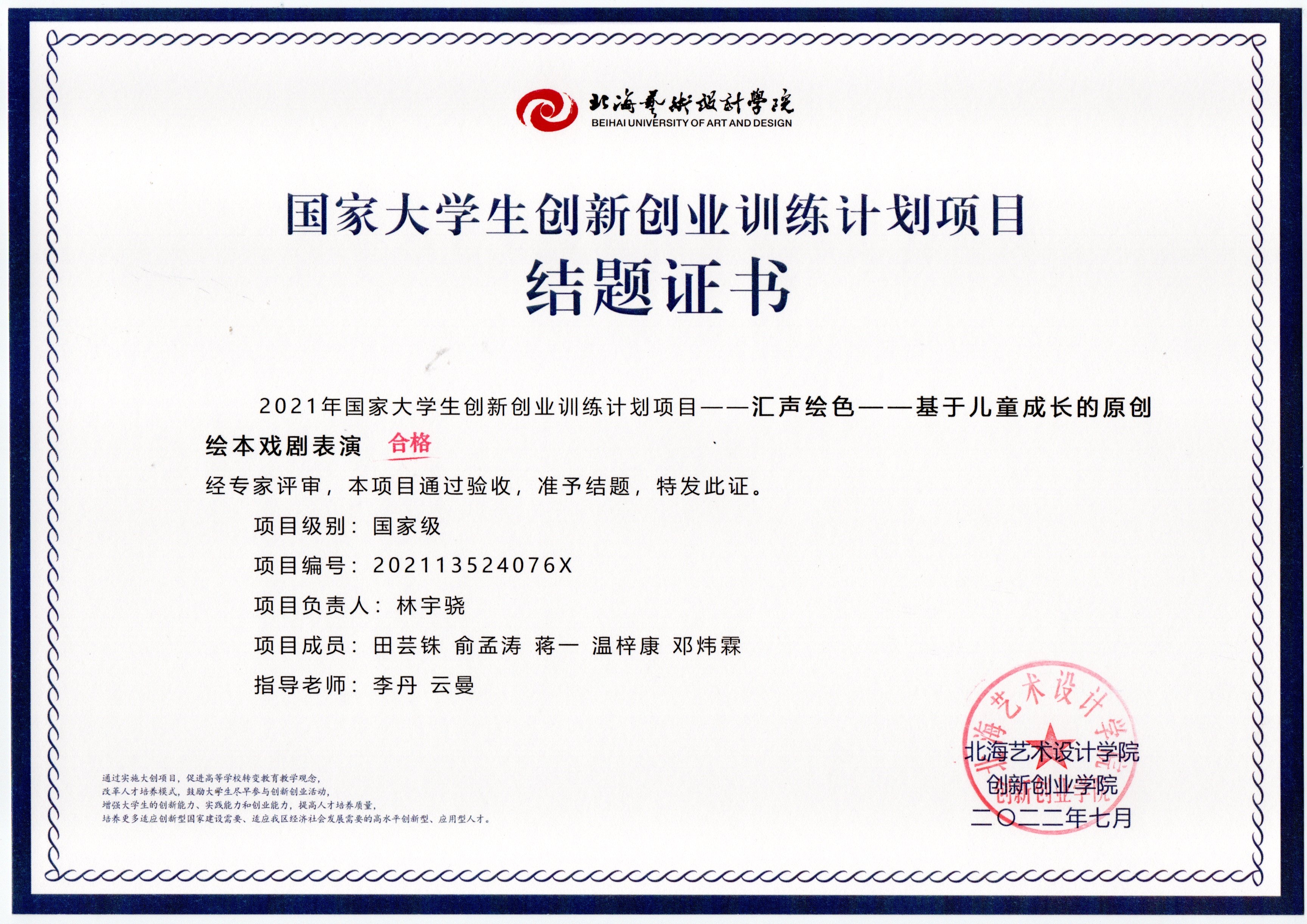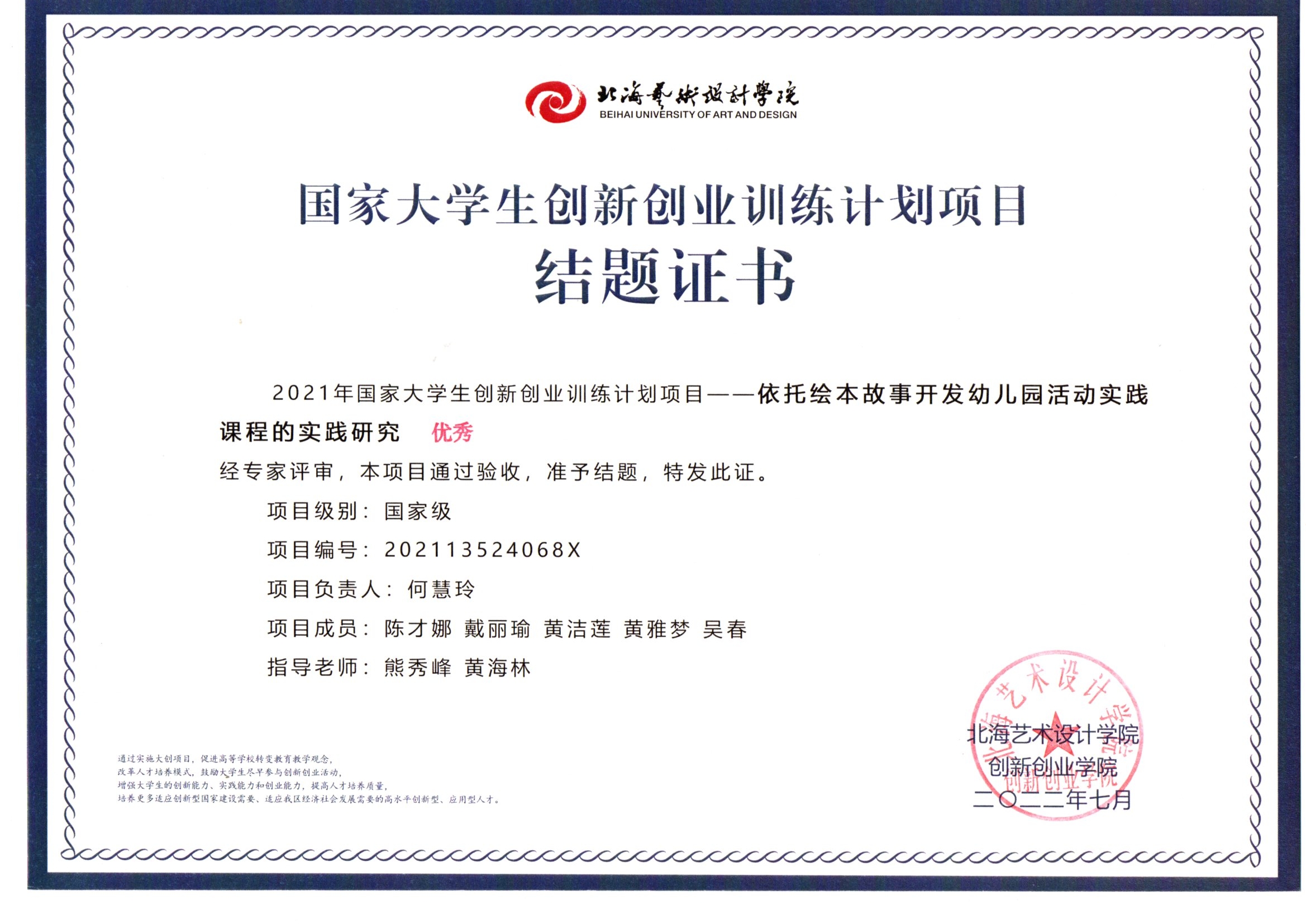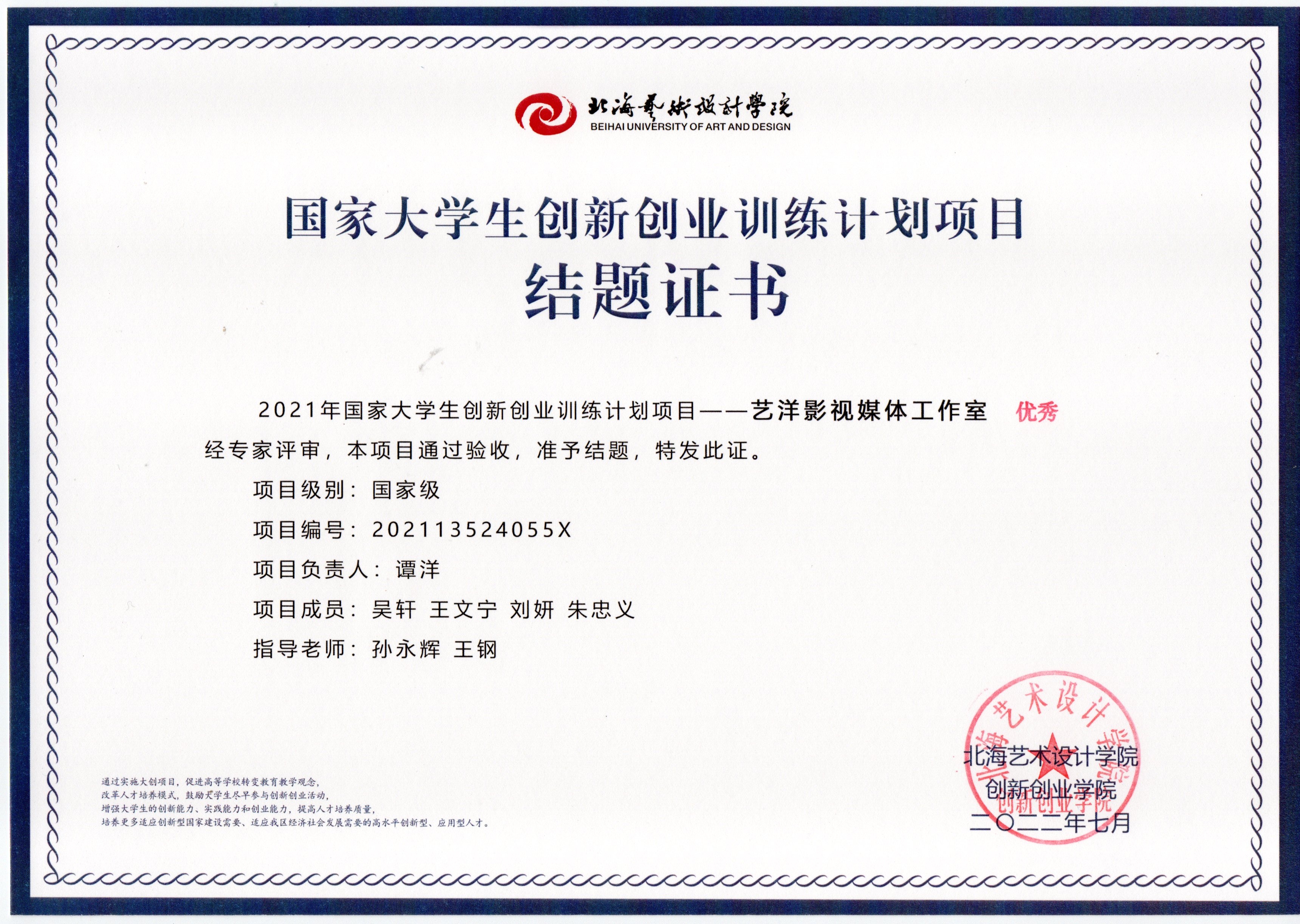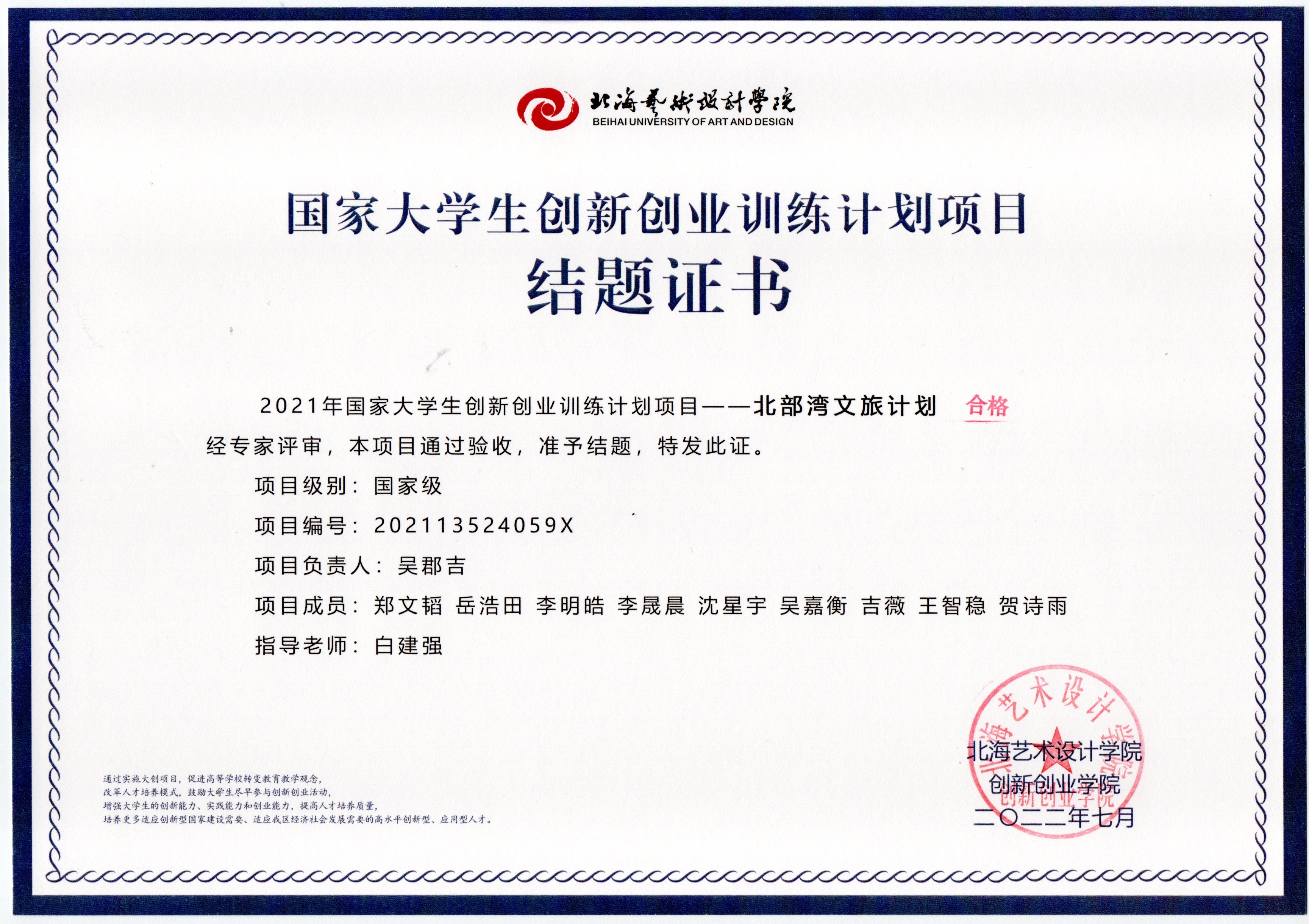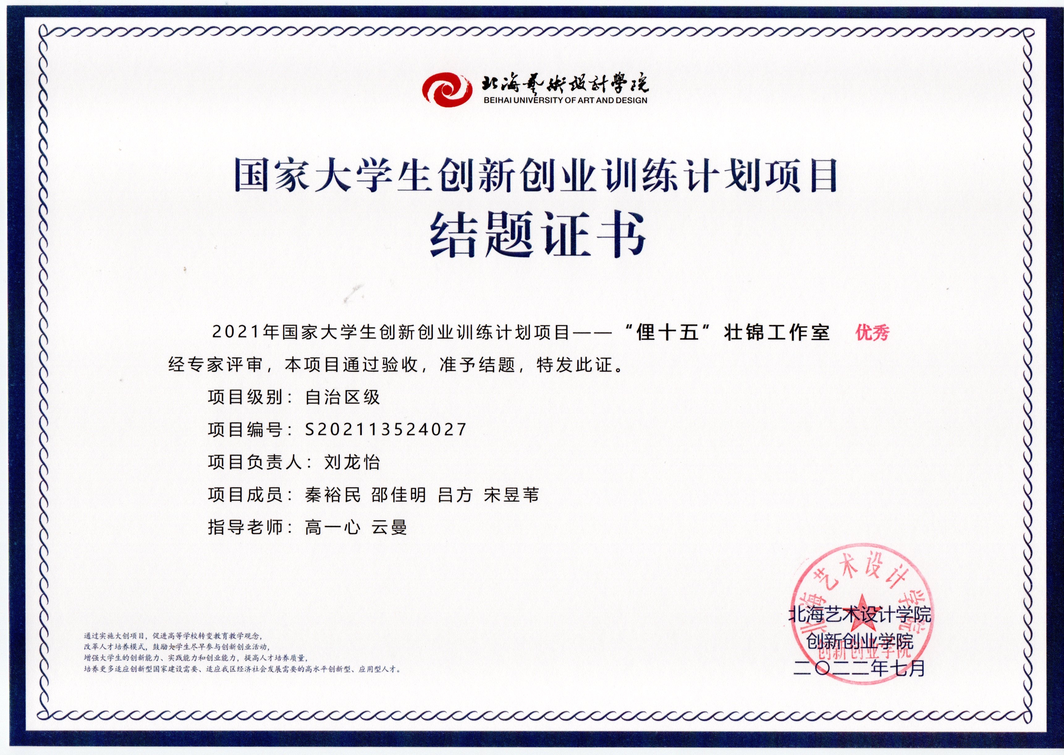 2022年大创项目结题证书(2021立项)