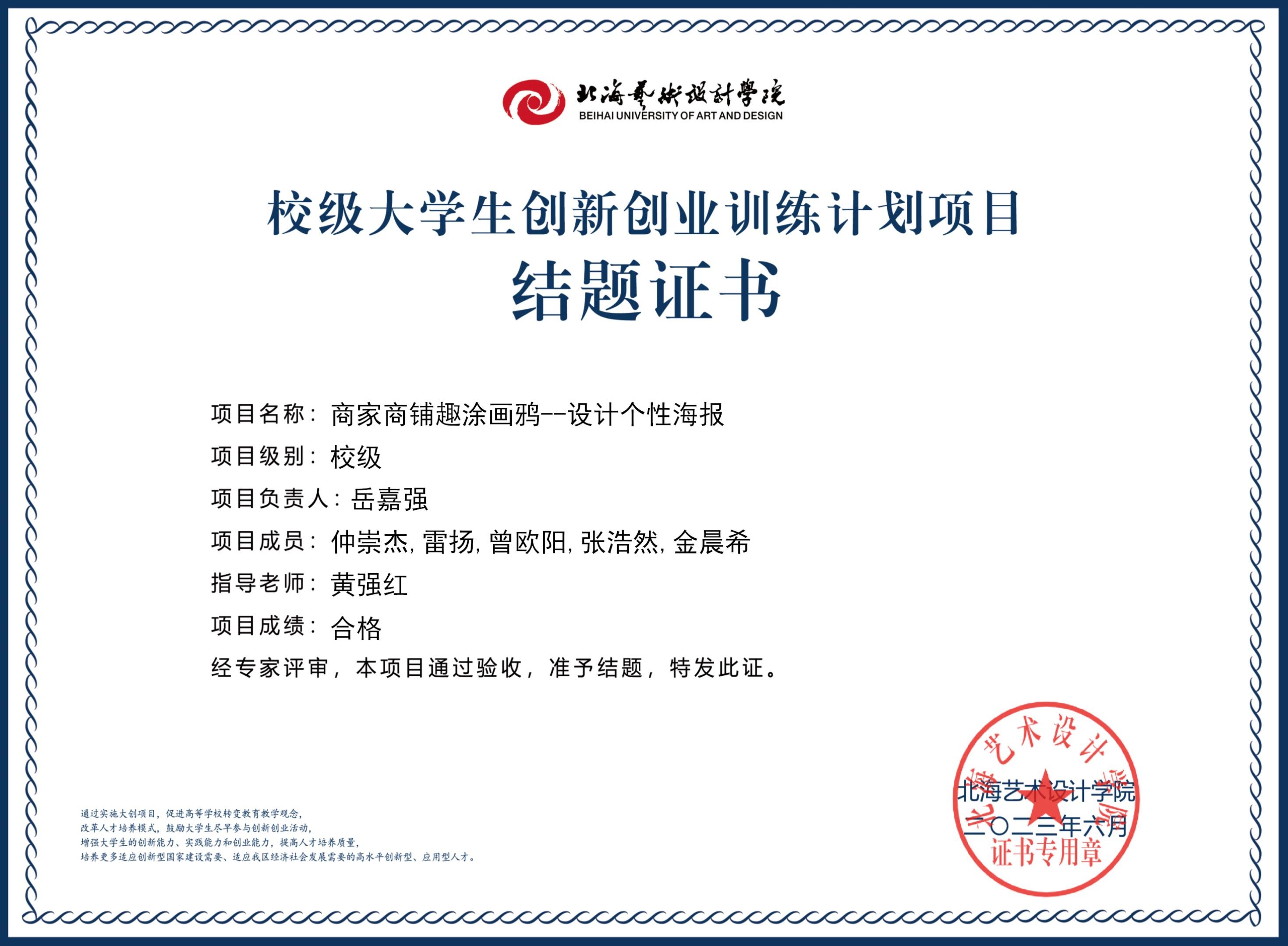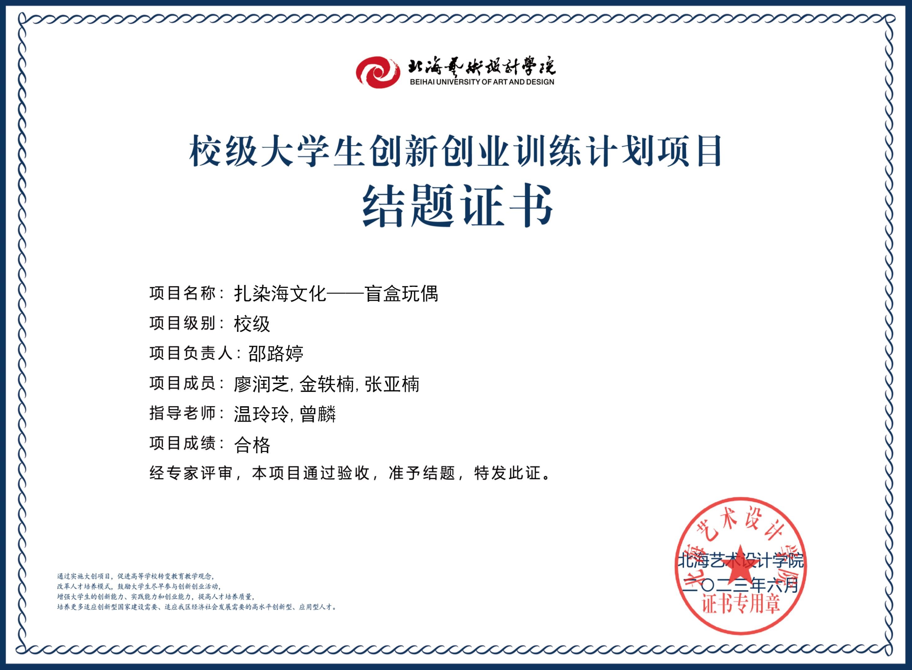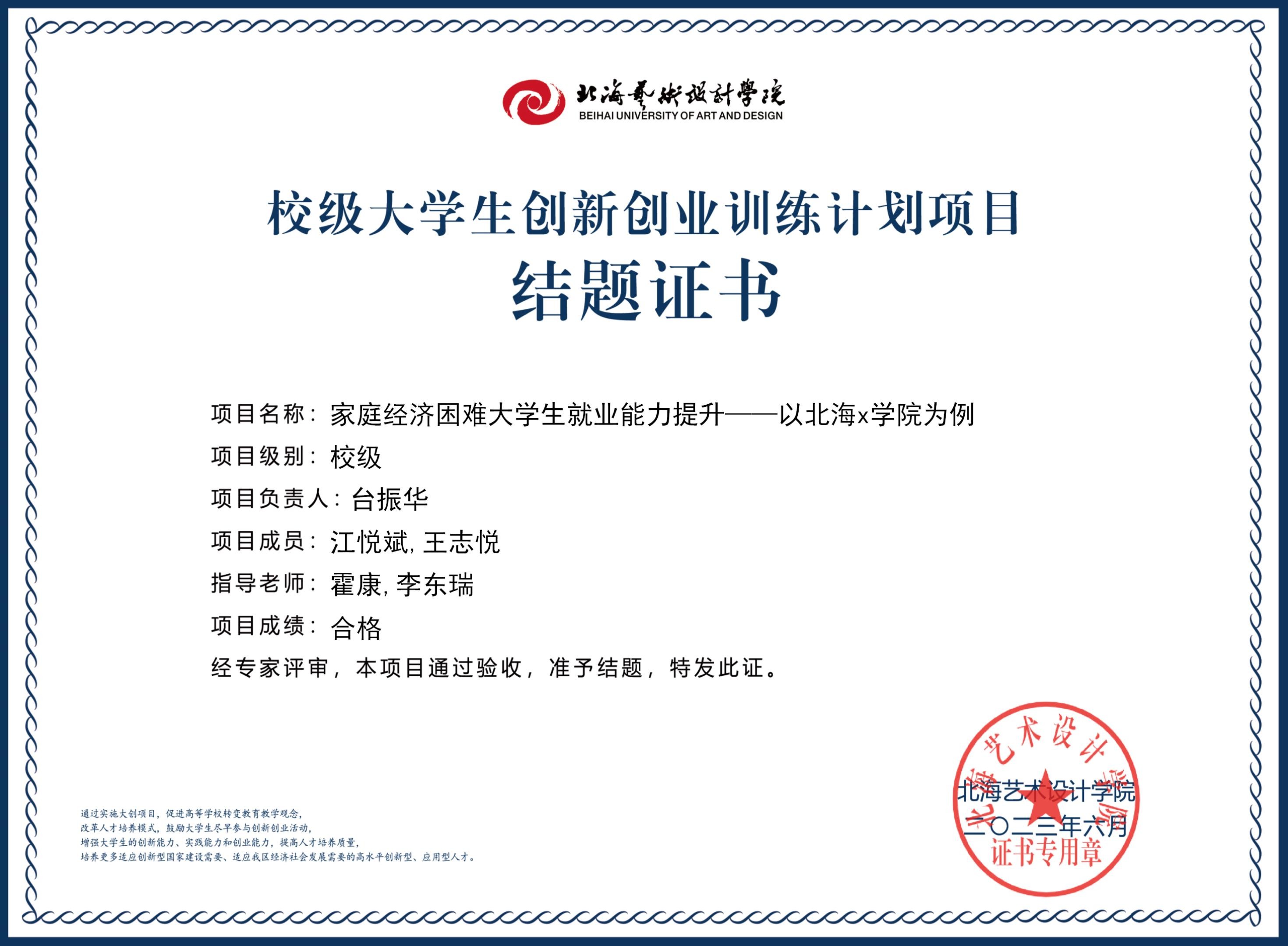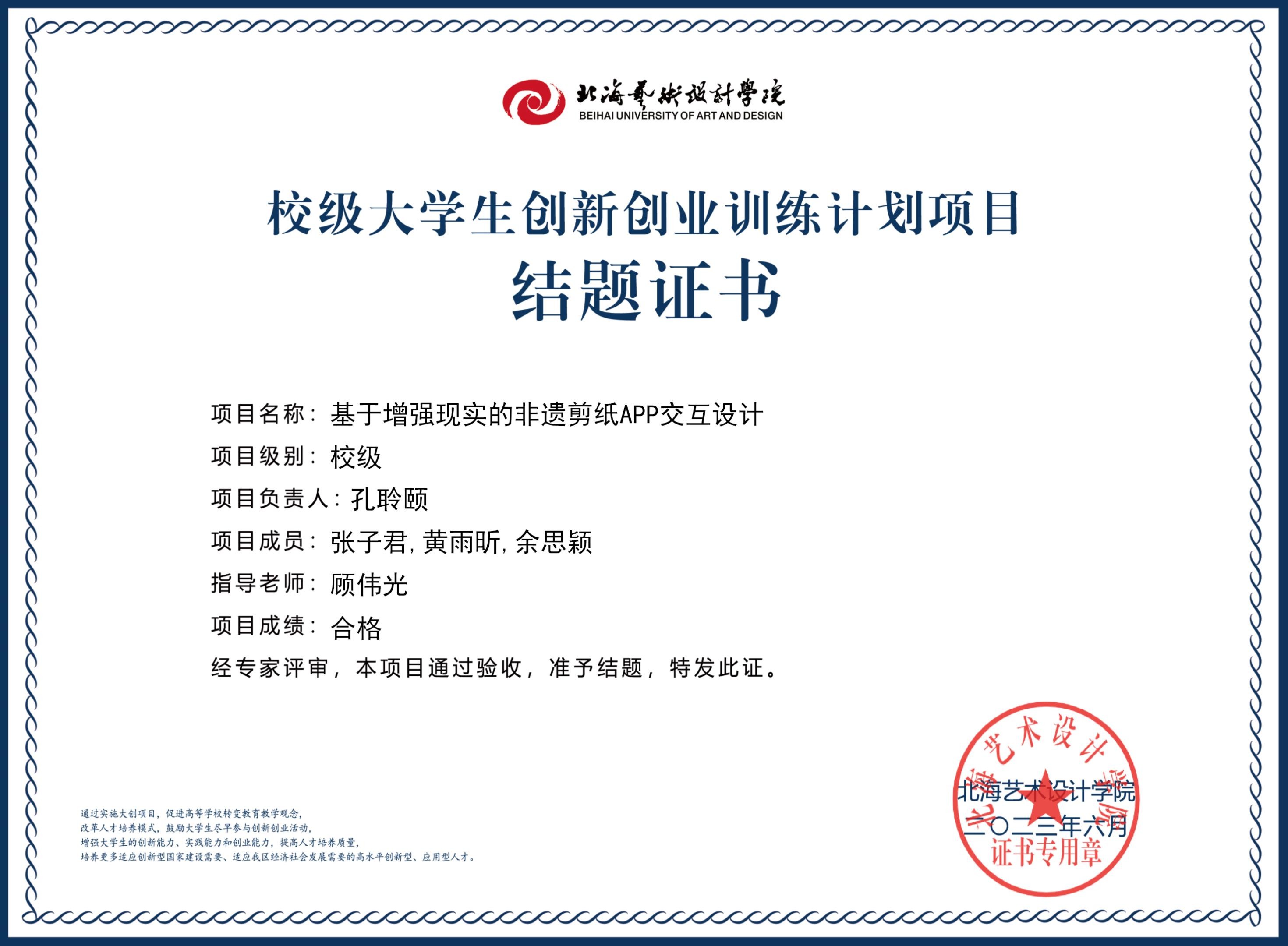 2023年校级大创项目结题证书