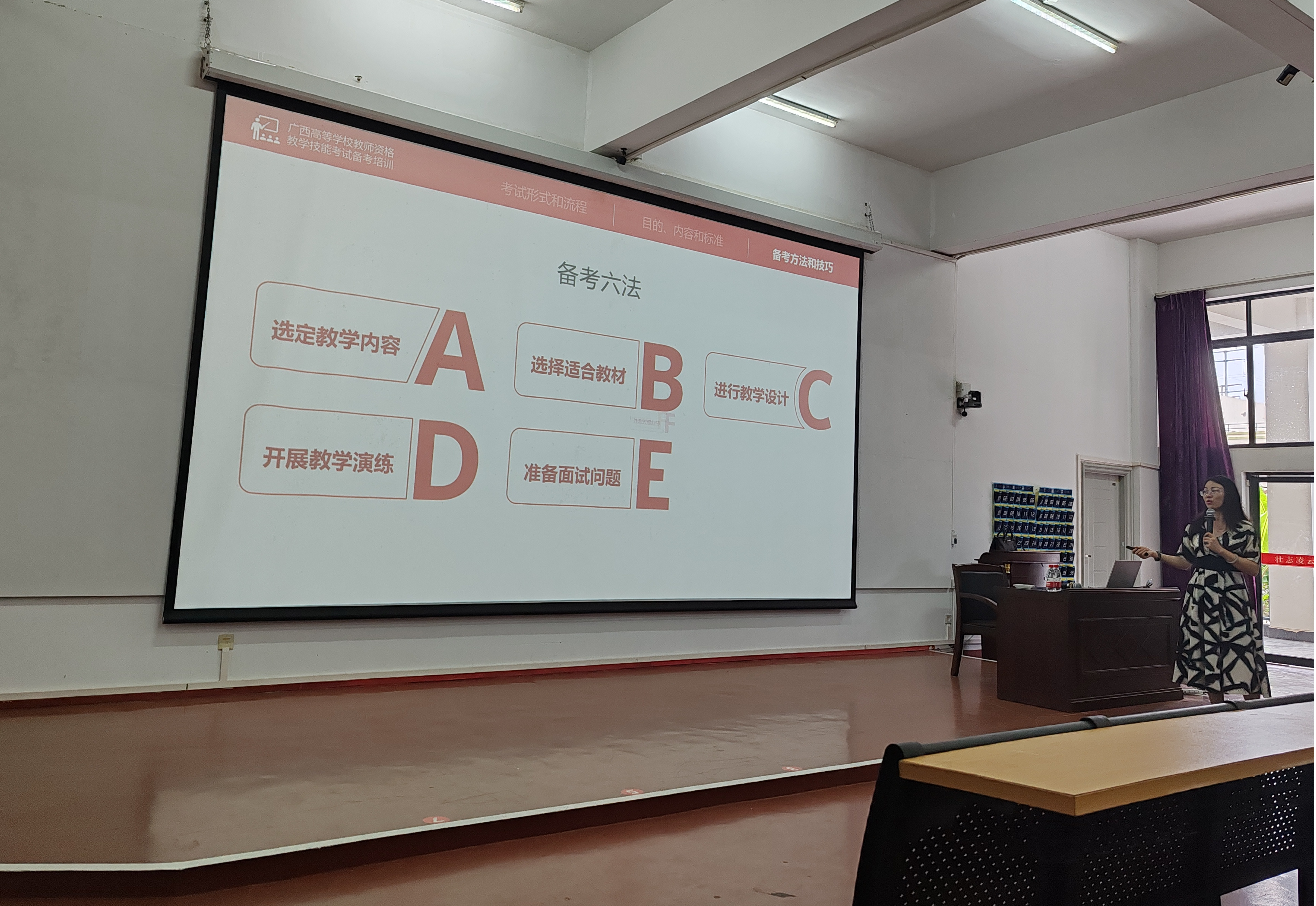 其中,教学技能考试备考方法和技巧为本次培训的重点,左婧副教授将其归结为“备考六法”,即选定教学内容、选择适合教材、进行教学设计、开展教学演练、准备面试问题、注意过程细节。