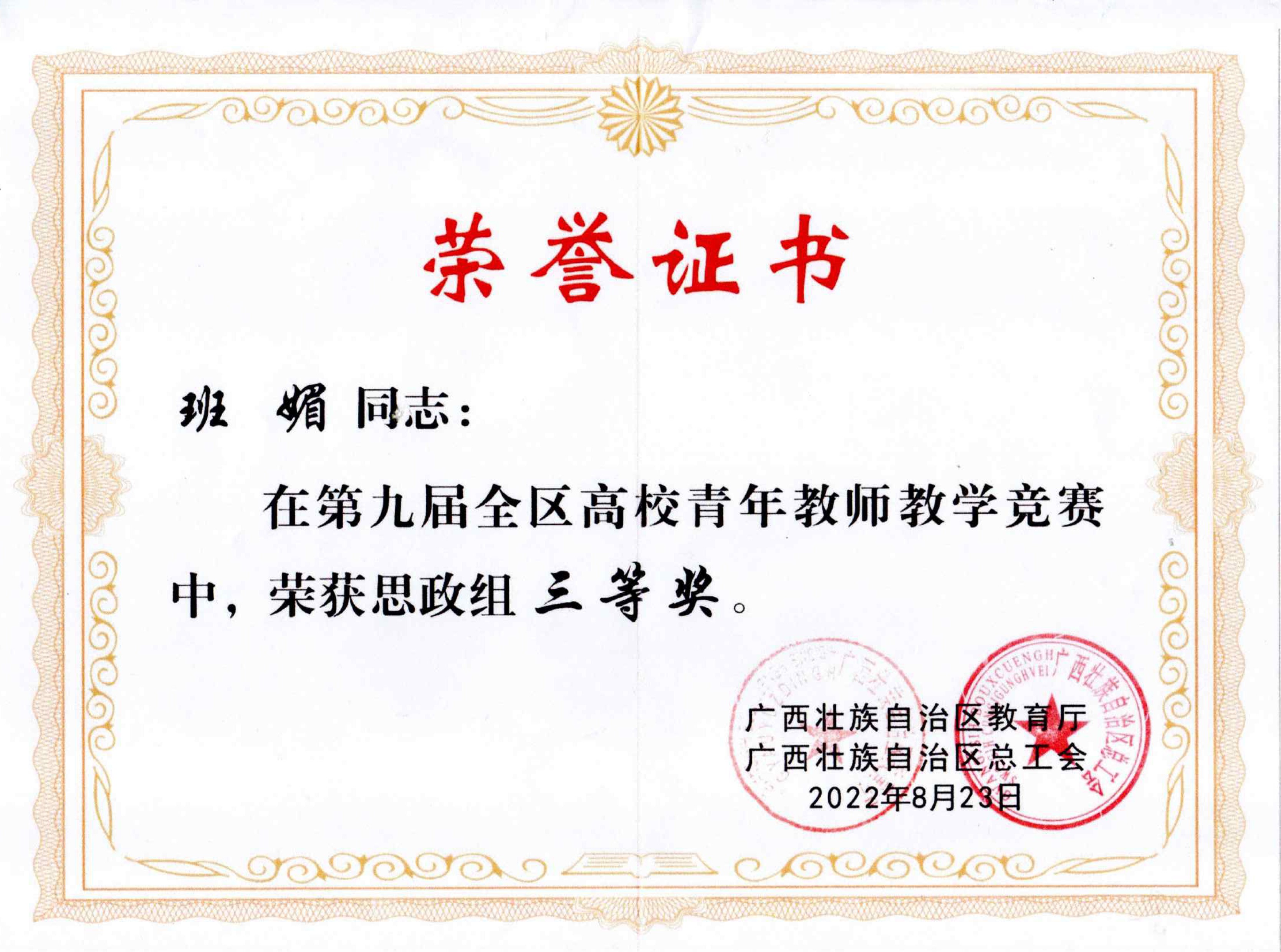 喜报:我院教师班媚荣获第九届全区高校青年教师教学竞赛思政组三等奖