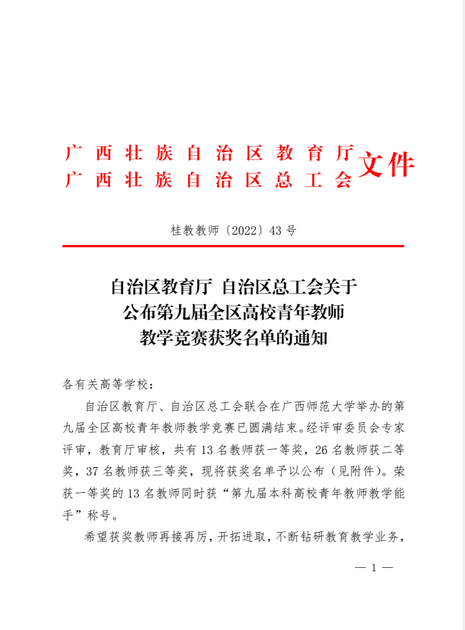 桂教教师〔2022〕43号自治区教育厅自治区总工会关于公布第九届全区高校青年教师教学竞赛获奖名单的通知.pdf