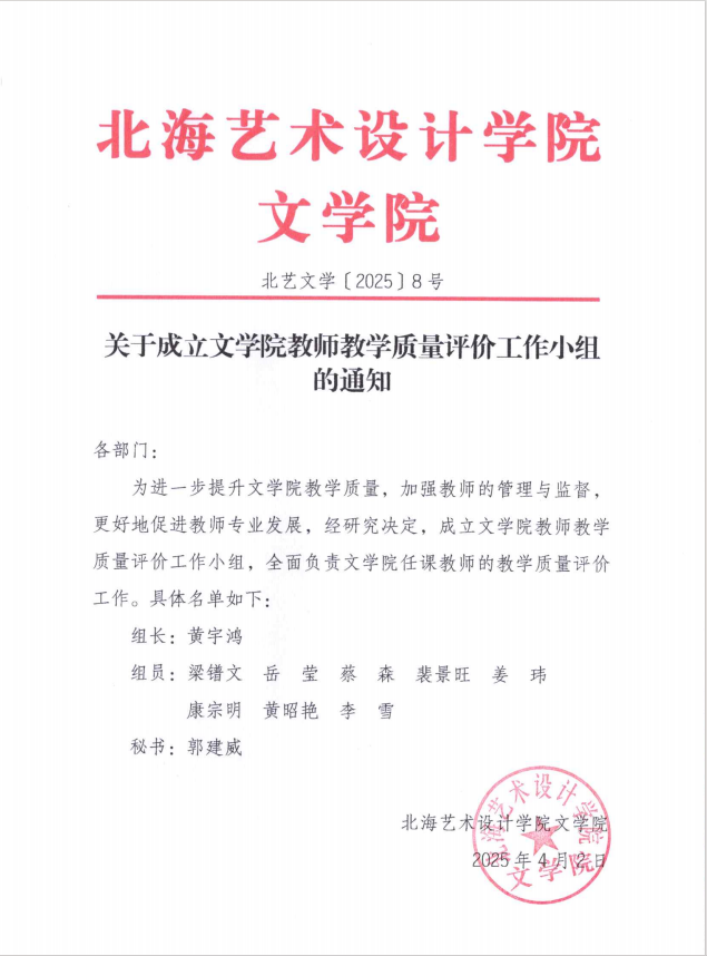 为进一步提升文学院教学质量,加强教师的管理与监督,更好地促进教师专业发展,经研究决定,成立文学院教师教学质量评价工作小组,全面负责文学院任课教师的教学质量评价工作。