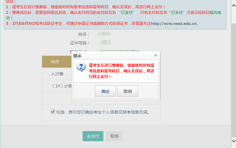 2.支付成功后报名流程完成,考生不能修改个人信息、科目信息或退考退费。
