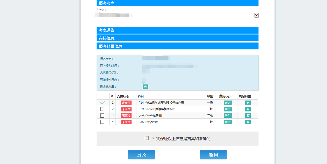 完成身份信息、基本信息、联系信息、在校信息的填写,完成报考考点、报考科目的选择,勾选“我保证以上信息是真实和准确的”,提交。