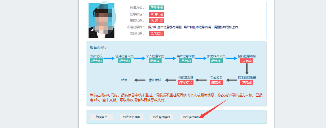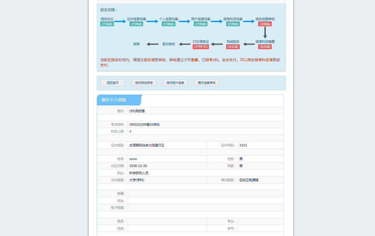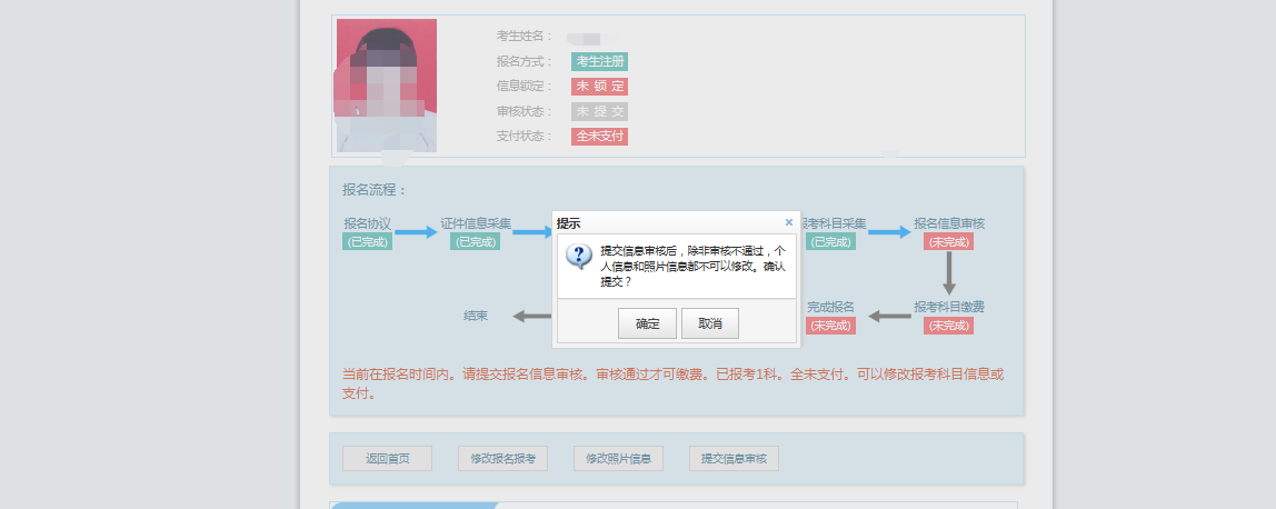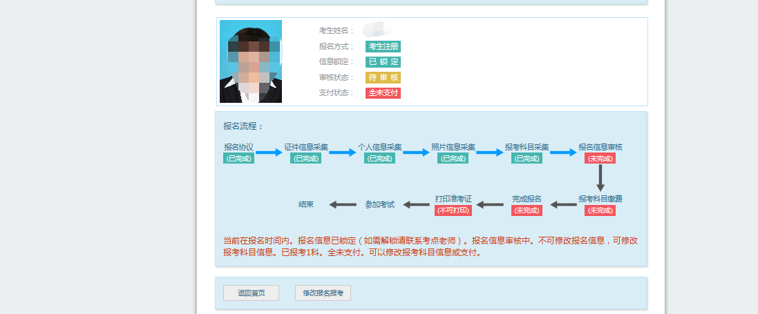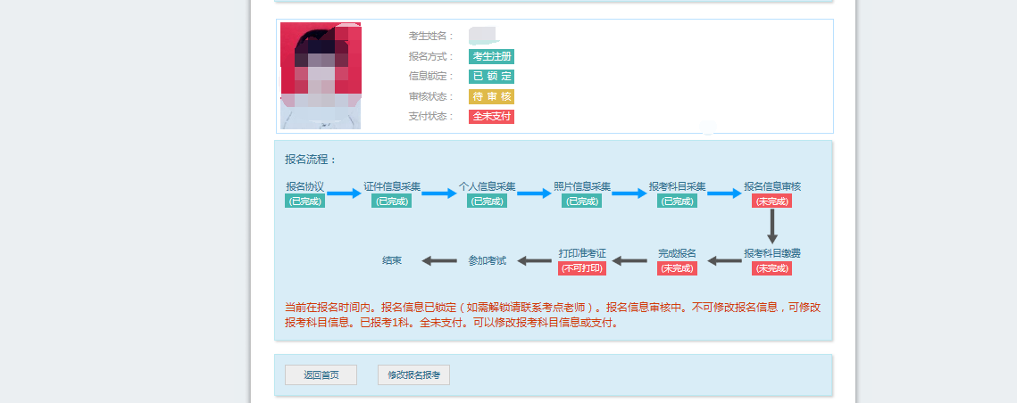 考生信息变为“待审核”状态,此时考生不能修改报名信息。