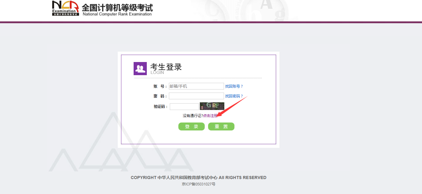 考生可以通过系统入口进入登录页面,通过登录页面“点击注册”的链接跳转: