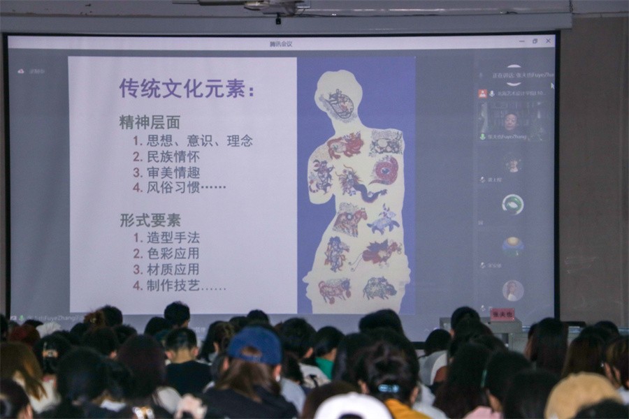 张夫也教授通过展示一系列传统文化元素在现代艺术与设计的应用,说明文化深刻地影响着艺术与设计的发展,并决定了艺术与设计的方向、风格、观念。但文化有糟粕和精华之分,张夫也教授强调对待优秀的文化要弘扬,糟粕的传统要摒弃。同时要重视创新的重要性,并深刻理解创新不是对既定状态简单的完善和提升,也不只是对已有存在的另类注解,而是在刷新固有的经典界面之后呈现出破土而出的生命气息。