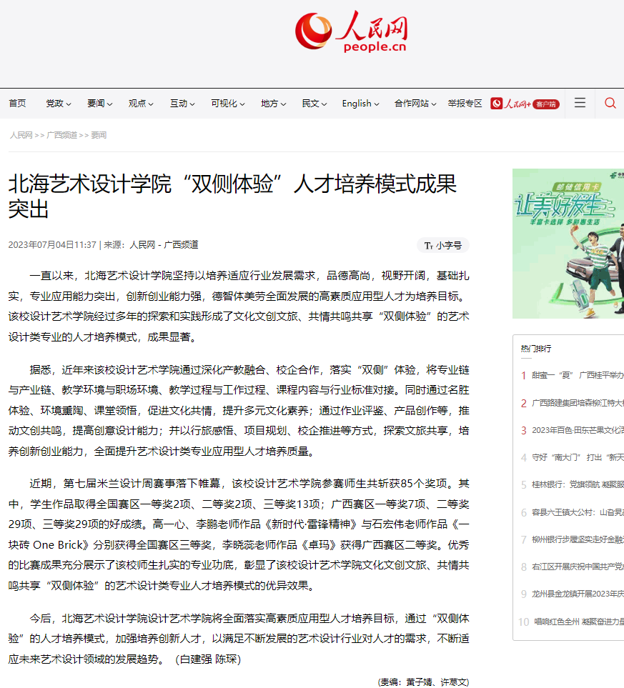 人民网:北海艺术设计学院“双侧体验”人才培养模式成果突出