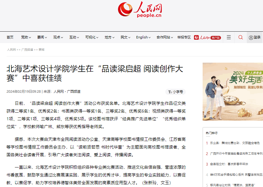 人民网:北海艺术设计学院学生在“品读梁启超 阅读创作大赛”中喜获佳绩