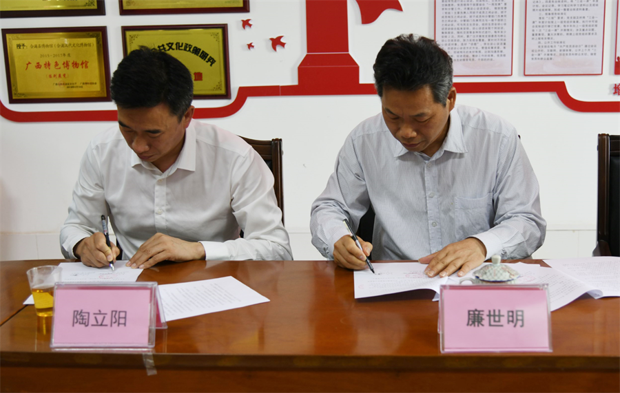 北海艺术设计学院陶立阳副校长与廉世明馆长签订合作协议。黄和梁摄