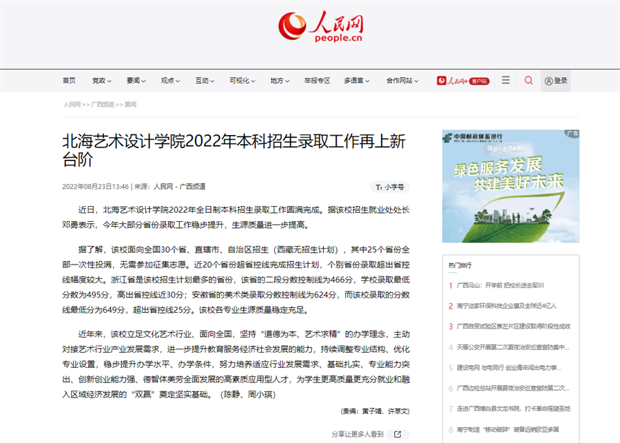 人民网:北海艺术设计学院2022年本科招生录取工作再上新台阶