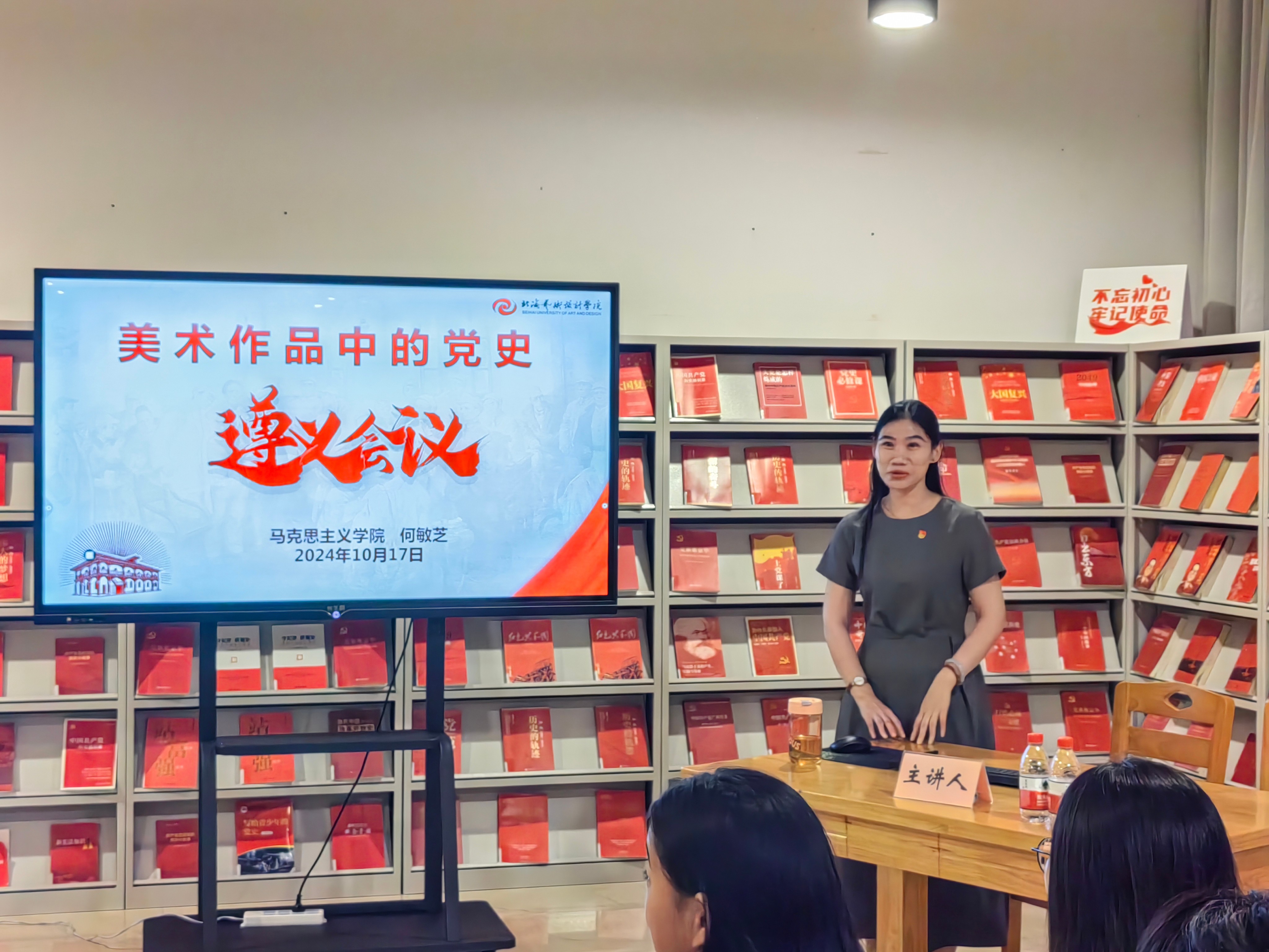何敏芝老师以《美术作品中的党史——遵义会议》为题,从经典美术作品入手,通过图像与历史的紧密结合,带领学生重温了1935年遵义会议召开的历史背景、过程和深远意义;这一幅幅的美术作品生动展现了革命先辈们坚定不移的革命信念和不懈奋斗的革命精神,不仅是艺术的瑰宝,更是党史的鲜活载体,激励着一代代中国人。她强调:遵义会议作为我们党历史上一次具有伟大转折意义的重要会议,确立了毛泽东在党中央和红军的领导地位,在极其危急的历史关头,挽救了党,挽救了红军,挽救了中国革命。