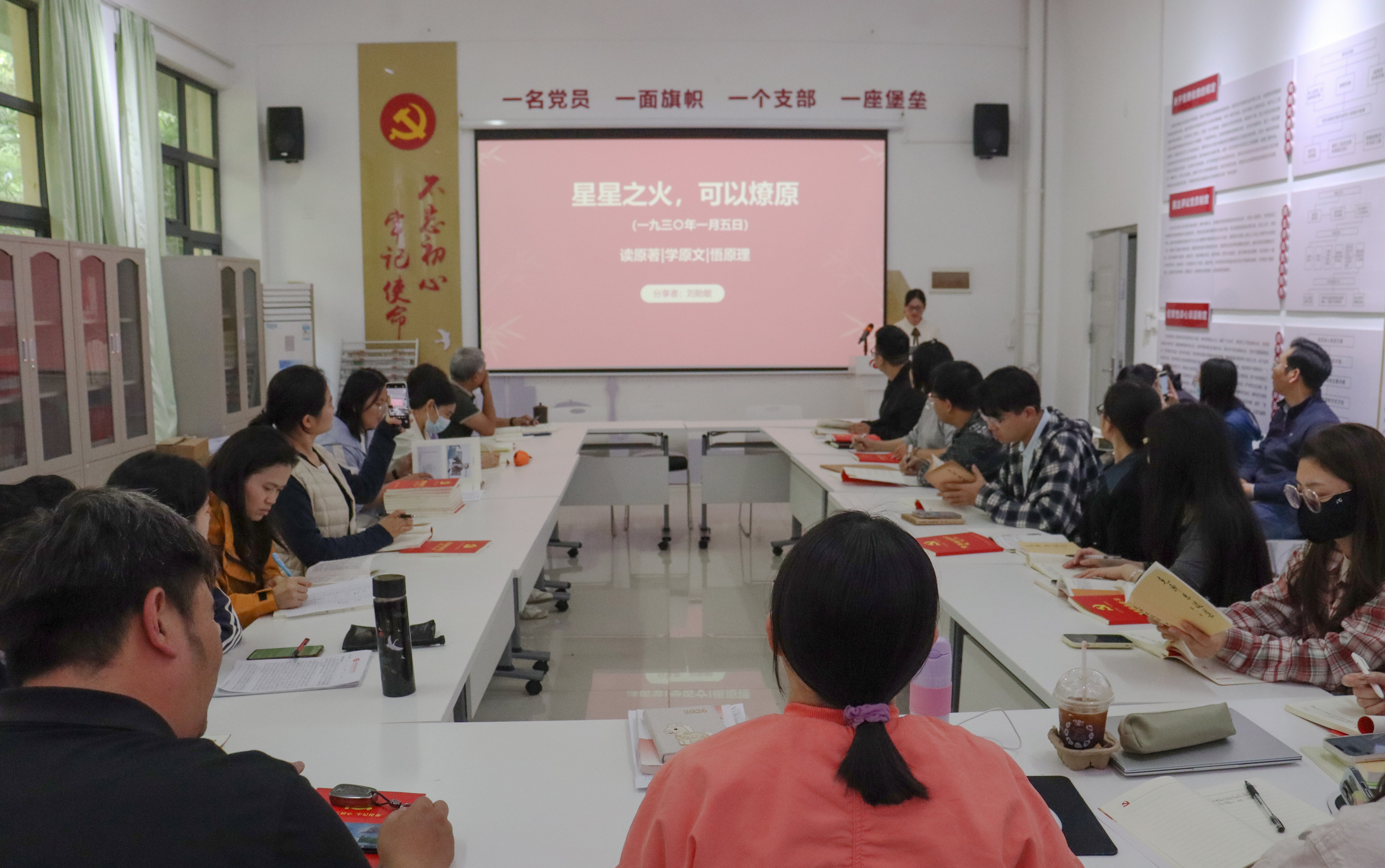 3月13日,马克思主义学院在西校区行政楼103红色驿站举行第三期马克思主义经典著作读书第七次活动。活动由马克思主义学院副院长罗秋梅主持,马克思主义学院中国近现代史纲要及中华民族共同体概论教研室主任刘贻敏主讲《星星之火,可以燎原》,马克思主义学院全体中青年教师参加。