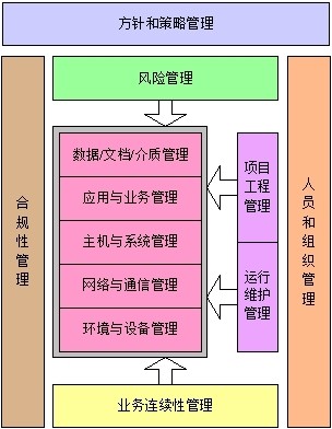 根据“方针和策略”,由“人员和组织”实施信息安全管理工作。在实施中主要从两个角度来考虑问题,即风险管理和业务连续性管理。