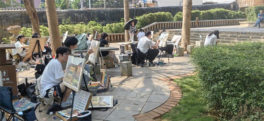 各专业教授和任课老师也纷纷深入实践活动,开展主题授课,对学生作品进行讲解指导,对学生创作过程中的疑难问题认真解答,给予学生新的创作视角和创作思维。每日外出实践写生后,专业教授和指导老师还会与学生一同进行交流学习,对当天的创作作品进行集中点评,指出作品存在的不足与优点。学生听取教授和指导老师的意见和建议,不断总结改进,加强专业知识理论和实践融合,为今后的学习和采风写生实践积累了更多经验。