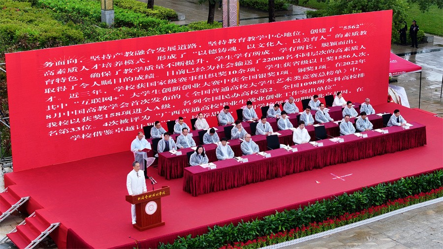 10月11日上午,我校在园博园校区蓝天白云广场举行2023年新生开学典礼。清华大学学术委员会副主任,原中国服装设计师协会主席,原清华大学美术学院党委书记、院长,北海艺术设计学院顾问委员会副主任李当岐教授;英国德比大学副校长亚历山大教授;北京邮电大学原党委书记王亚杰教授;原北京化工大学教授、国家特殊津贴专家曹维良教授;西北工业大学北京研究院院长方文杰教授;学校董事长郑念贻及学校党政领导范徽忠、卢新华、彭仁、胡胜、陶立阳、邱杰、黄侃明、刘朝雄、包建明、何煜、王斌等出席典礼,有关职能部门负责人、各二级学院负责人、教师代表和2023级3878名新生参加典礼。典礼由学校党委书记范徽忠主持。