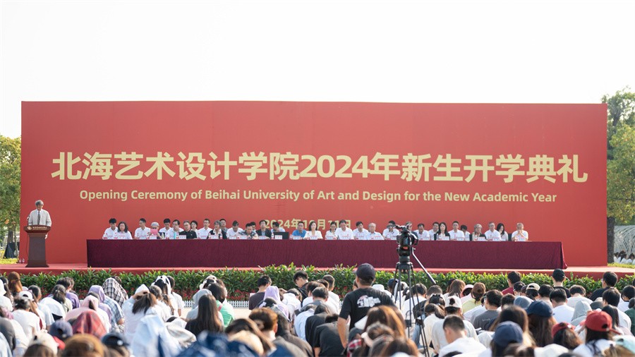 10月11日,我校2024年新生开学典礼在园博园校区蓝天白云广场举行。北海市人民政府副秘书长、北海市人民政府办公室副主任蒲笛春;北海市教育局党组成员、副局长徐广辉;清华大学学术委员会副主任、博士生导师,原中国服装设计师协会主席,原清华大学美术学院党委书记、院长,北海艺术设计学院顾问委员会副主任李当岐;英国切斯特大学国际事务副校长兼艺术、人文与社会科学学院执行院长大卫·麦格拉维;日本武蔵野美术大学教授,日本著名生成AI人工智能设计师、舞台映像艺术设计师,中国中央电视台特邀艺术顾问大野一興;日本文化学园大学教授、日本色彩学会会员、北海艺术设计学院特聘教授田森恭子;日本著名平面设计师、创意总监兼艺术总监太田弘之;国家一级导演、著名编导、北海艺术设计学院舞蹈学院院长吴明奇;二级演员、北海艺术设计学院舞蹈学院副院长任家和;日中美术文化交流协会理事、北海艺术设计学院特聘教授尤海明;北海银滩开发投资股份有限公司总经理詹海松、副总经理关键;北海园博园资产管理有限公司副总经理苏小丹;学校党委书记覃宪儒,校长卢新华,常务副校长胡胜,党委副书记陈毅华、彭仁、刘承初,副校长邱杰、陶立阳、黄侃明、刘朝雄、包建明、何煜,总督学王斌,学校纪委书记王照伟等出席典礼,有关职能部门负责人、各二级学院负责人、教师代表和2024级3700多名新生参加典礼。典礼由学校党委书记覃宪儒主持。