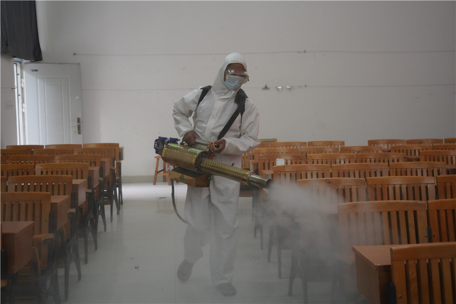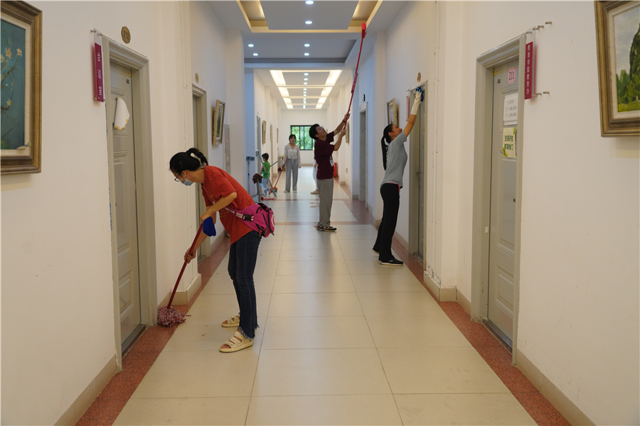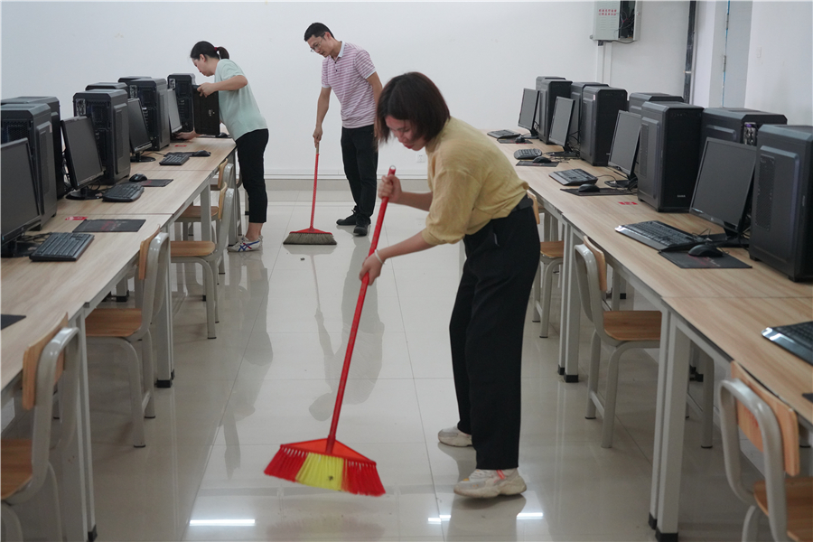 按照校园疫情防控方案工作要求,学校各单位根据责任分工对校园绿化带、运动场、图书馆、教学楼、工作室、办公楼、宿舍、食堂等人员密集区域进行清洁大扫除、更换防疫标识。全体教职工相互配合、不辞劳累,细致地清除校园内落叶、积水、污物,擦拭教室门把手、讲台、课桌、空调,检查室内线路安全……全力做到校园无死角清洁,全方位排查校园安全隐患。
