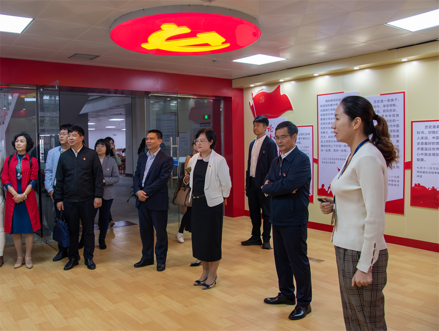 会前,张阳一行参观了该校红色广西——党性教育主题室暨爱国主义教育基地、课程思政(国际语言)实践基地、全媒体交互式跨专业语言应用中心、校展馆、四史馆、教师发展中心。