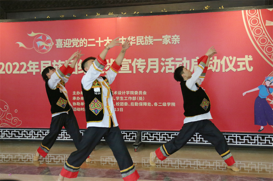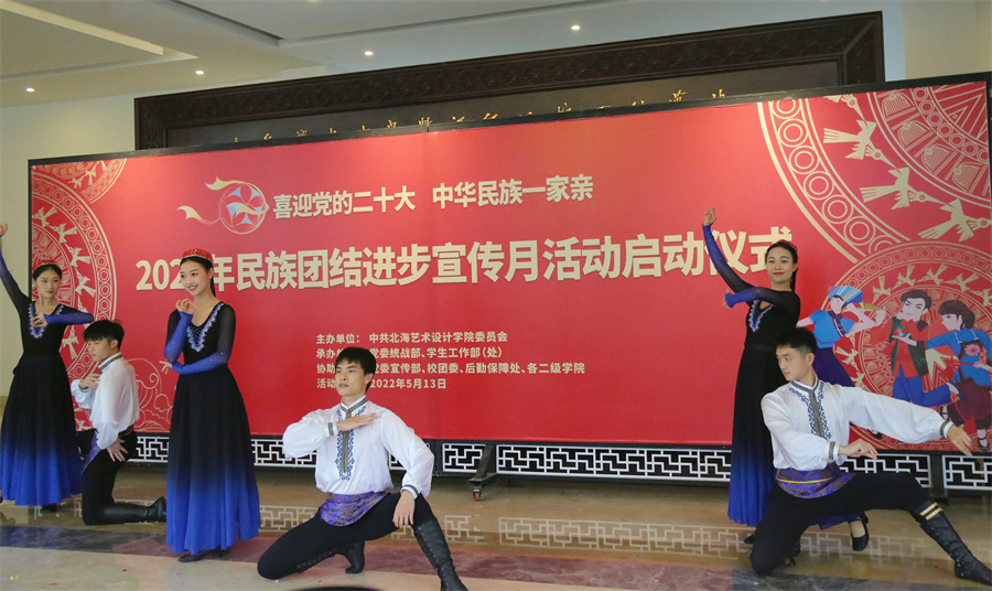 启动仪式上,北海艺术设计学院学生激情上演富有民族特色的歌曲《三月三》《祝酒歌》,极具民族风采的舞蹈《民族大联欢》,身着壮族、维吾尔族、苗族、傣族、蒙古族等少数民族特色服饰的学生表演赢得现场阵阵掌声,最后的汉服走秀节目《衣冠尚国》,充分展示了汉服文化的魅力,通过倾情的演绎,表达对民族团结进步的美好祝愿。