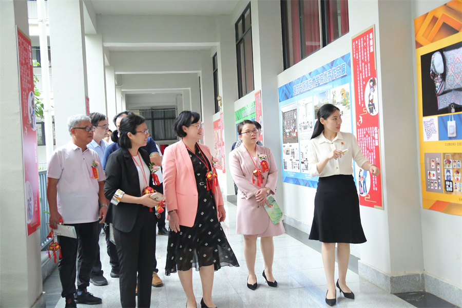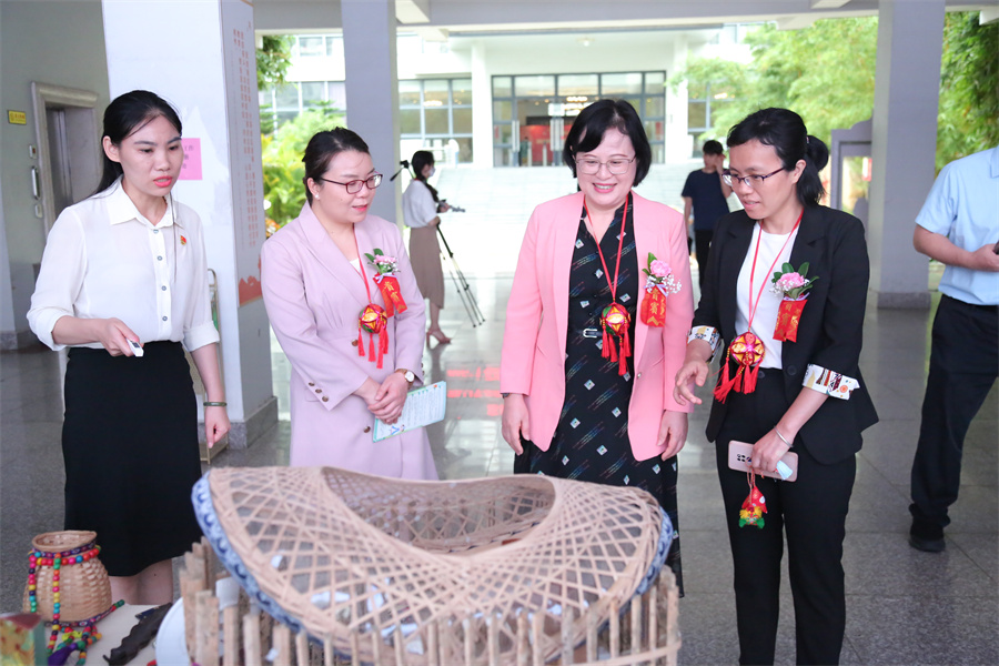 启动仪式结束后,张阳等学校领导一行陪同邓秋莹参观学校民族团结进步教育基地,先后观看了国家民族工作情况、民族团结进步创建工作要求、56个少数民族历史文化、民族团结典型故事和人物、学校民族团结主题作品展示等,通过听取工作人员介绍、观看展板、手工艺品实物展示等形式,详细了解历届中央民族工作会议精神,我国少数民族基本情况,广西民族工作概况及学校民族团结进步创建工作成效。