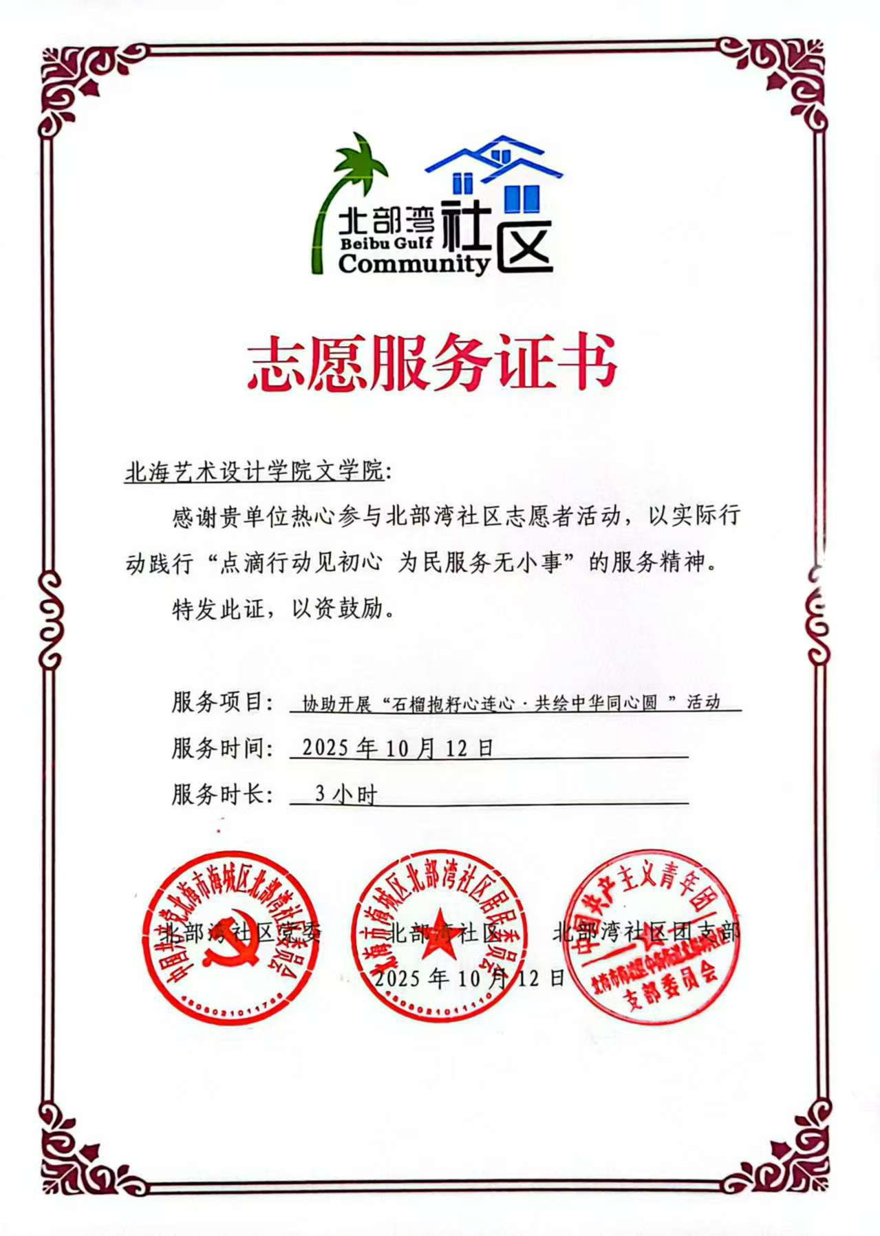 为践行社会主义核心价值观,弘扬“奉献、友爱、互助、进步”的志愿服务精神,进一步加强基层团组织建设,10月12日,文学院组织各年级团支部代表在北部湾社区协助开展“石榴抱籽心连心·共绘中华同心圆”社区志愿服务活动。该活动由文学院分团委书记马有泽老师指导,文学院分团委组织工作部主席李敏组织各年级团支部代表以及分团委代表参与。
