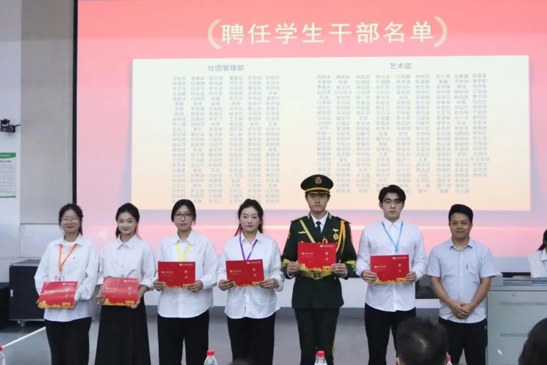 团委书记唐良春为各学生组织代表颁发聘书,并与聘书代表合影留念,这一仪式不仅是对学生组织代表过往努力的肯定,更象征着他们肩负新的使命与责任,激励着他们在未来继续为学校和同学们贡献力量,推动校园文化蓬勃发展。