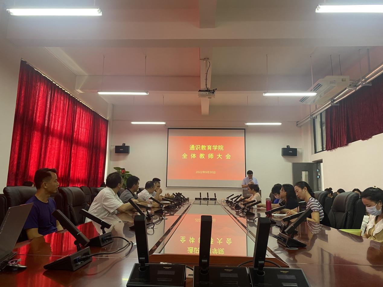 2022年9月30日15:00,通识教育学院在图书馆四楼会议室召开全体教师大会,副校长陶立阳、通识教育学院院长杨莹、副院长黄丹出席会议,会议由综合办公室主任王志华主持。