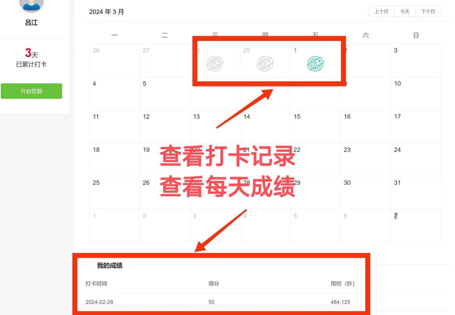 参赛者在竞赛期,每人每天仅限打卡一次(每次打卡任务共10道题,每题10分,且为随机抽取)答题时间为30分钟,提交试卷后,系统自动记录答题分数、时长和累积打卡天数。