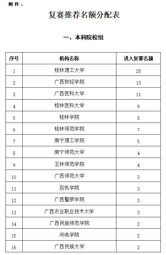 第七届广西高校大学生“铭记抗战烽火传承抗战精神”朗诵大赛初赛作品征集阶段已结束,根据赛制,各参赛馆自行组织校内选拔赛,按参赛作品3%的比例(四舍五入,不足1人的推荐1人)选出作品进入复赛。各组推荐参加复赛的总人数控制在120人以内,超额按照各馆参赛人数的占比进行适当调整。现将各馆复赛推荐名额公布(见附件)。