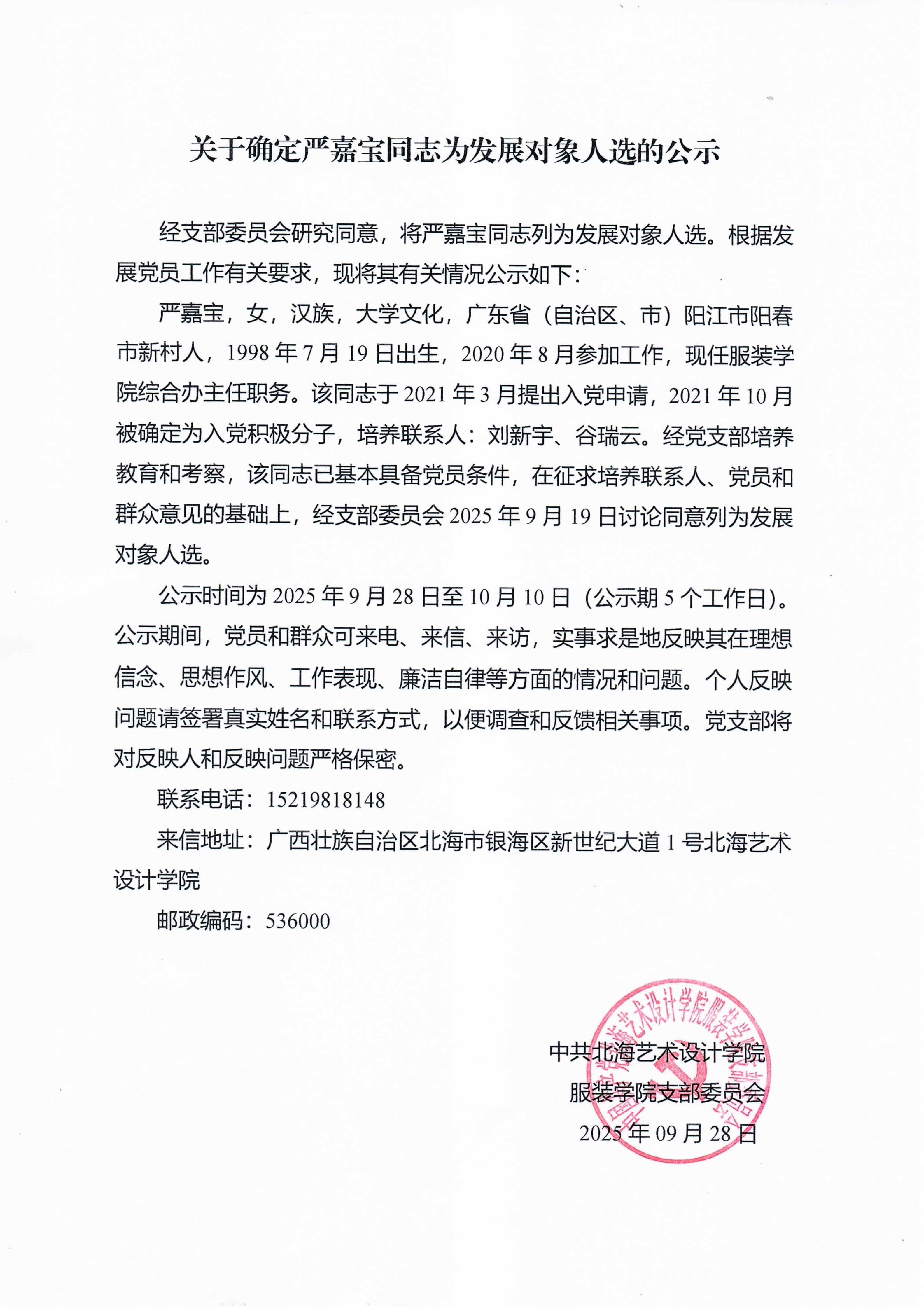 关于确定严嘉宝同志为发展对象人选的公示