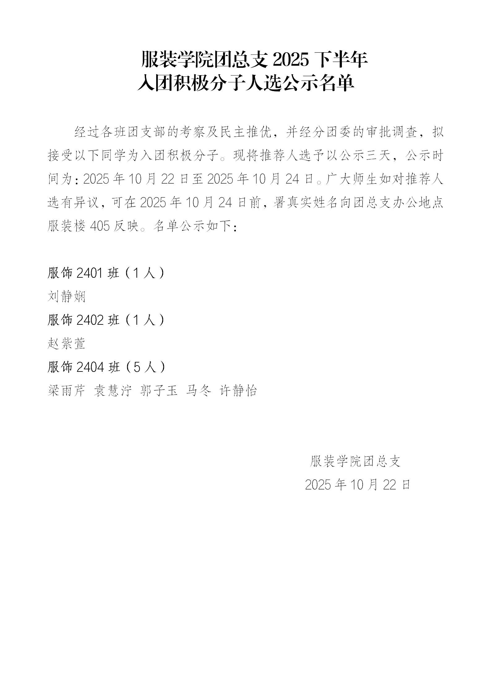 服装学院团总支2025下半年 入团积极分子人选公示名单