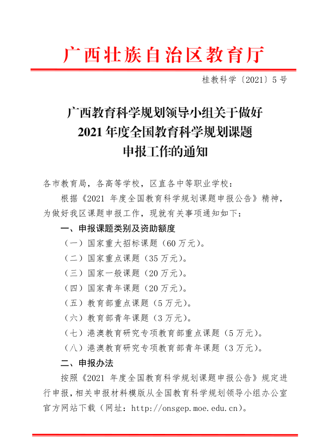 广西教育科学领导规划小组关于做好2021年度全国教育科学规划课题申报工作的通知