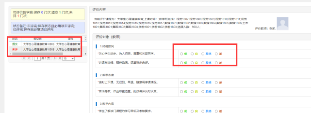(三)如下图:点击左边未评价课程,在右边完选择相应选项并填写意见或建议。注:未完成评价学生不可查询本学期成绩。