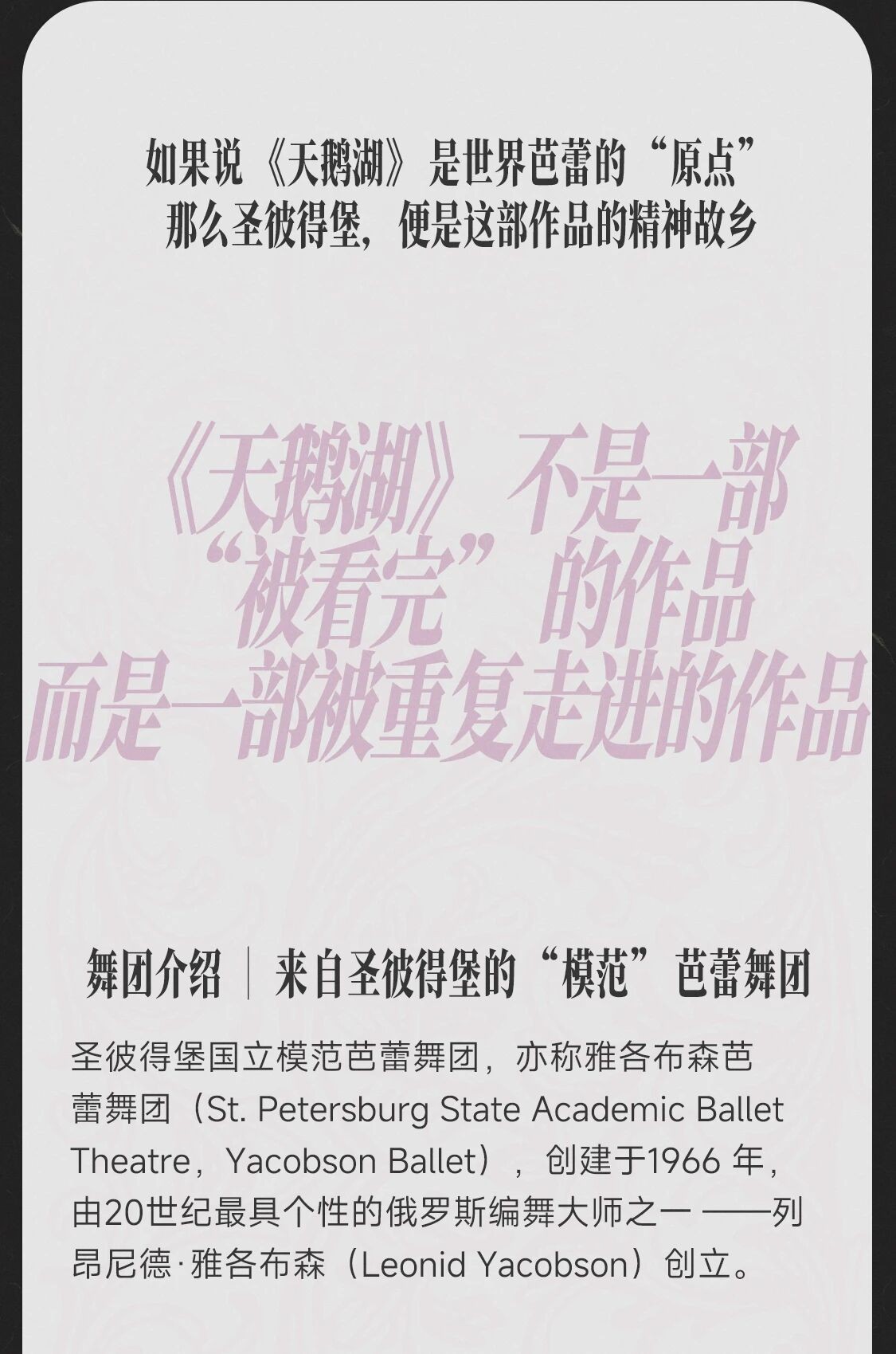如果说《天鹅湖》是世界芭蕾的“原点”,那么圣彼得堡,便是这部作品的精神故乡。圣彼得堡国立模范芭蕾舞团,亦称雅各布森芭蕾舞团,创建于1966年,由20世纪最具个性的俄罗斯编舞大师之一—— 列昂尼德·雅各布森创立。